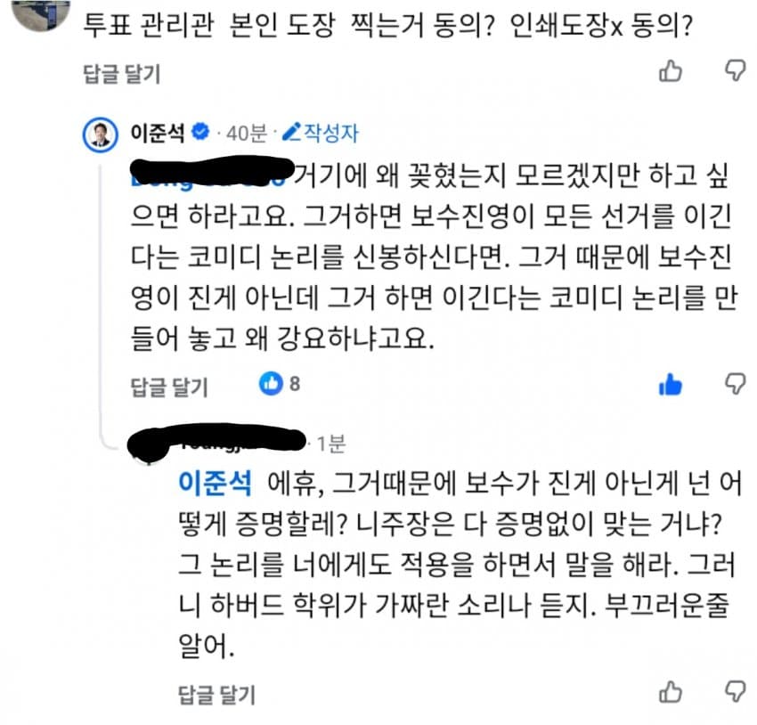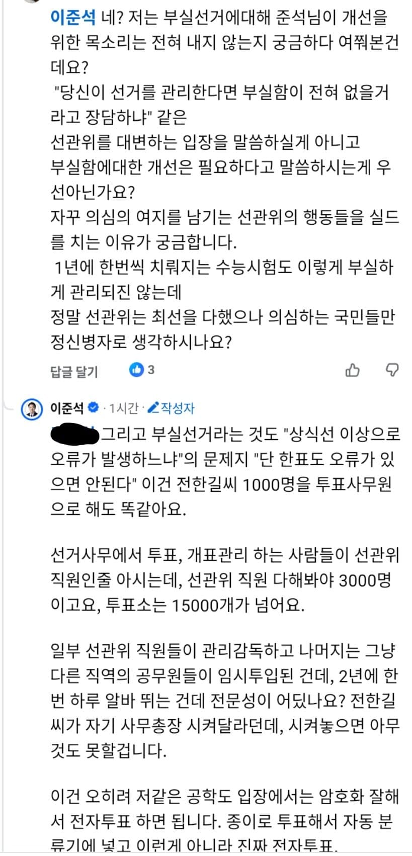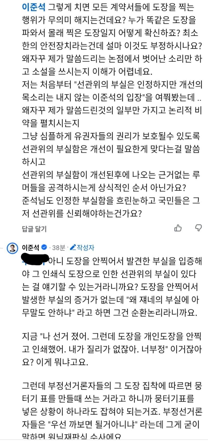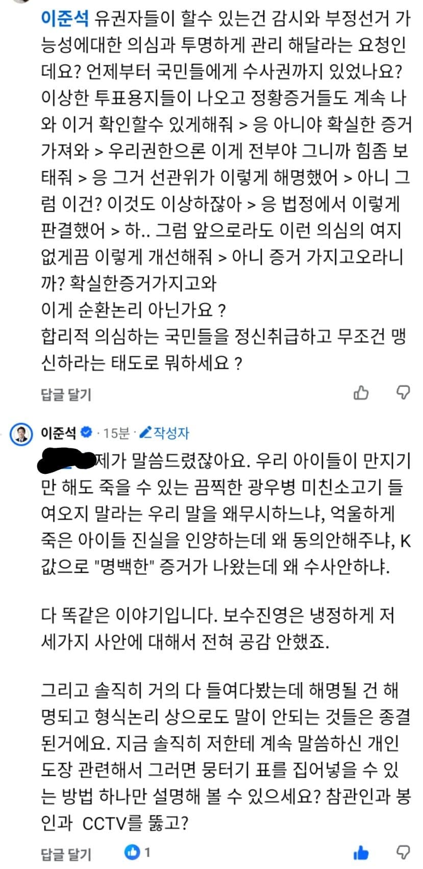 이준석 : 부정선거 없다 선거는 완벽하다전한길 : 의심가는 정황이 많다 검증해보자이준석 : 검증도 수사도 감사도 안된다 완벽한 증거를 제시해라ㅋㅋㅋㅋㅋㅋㅋ