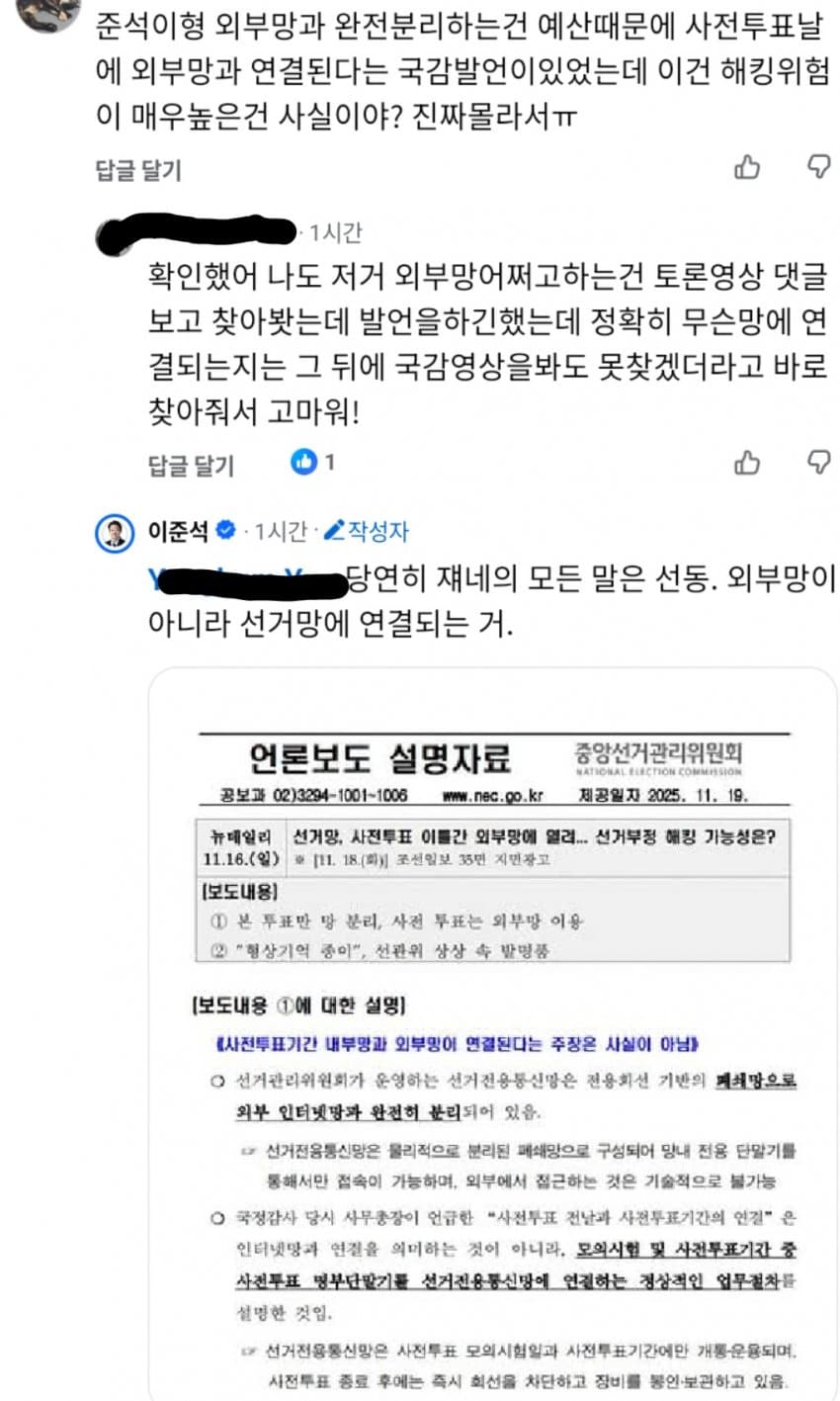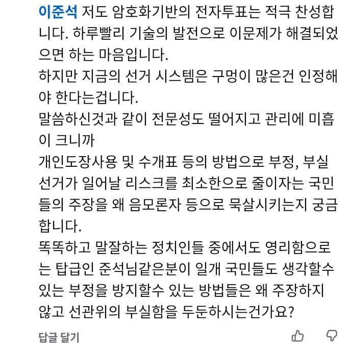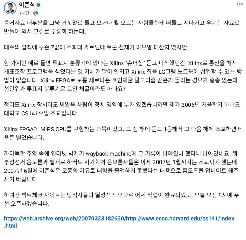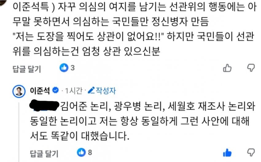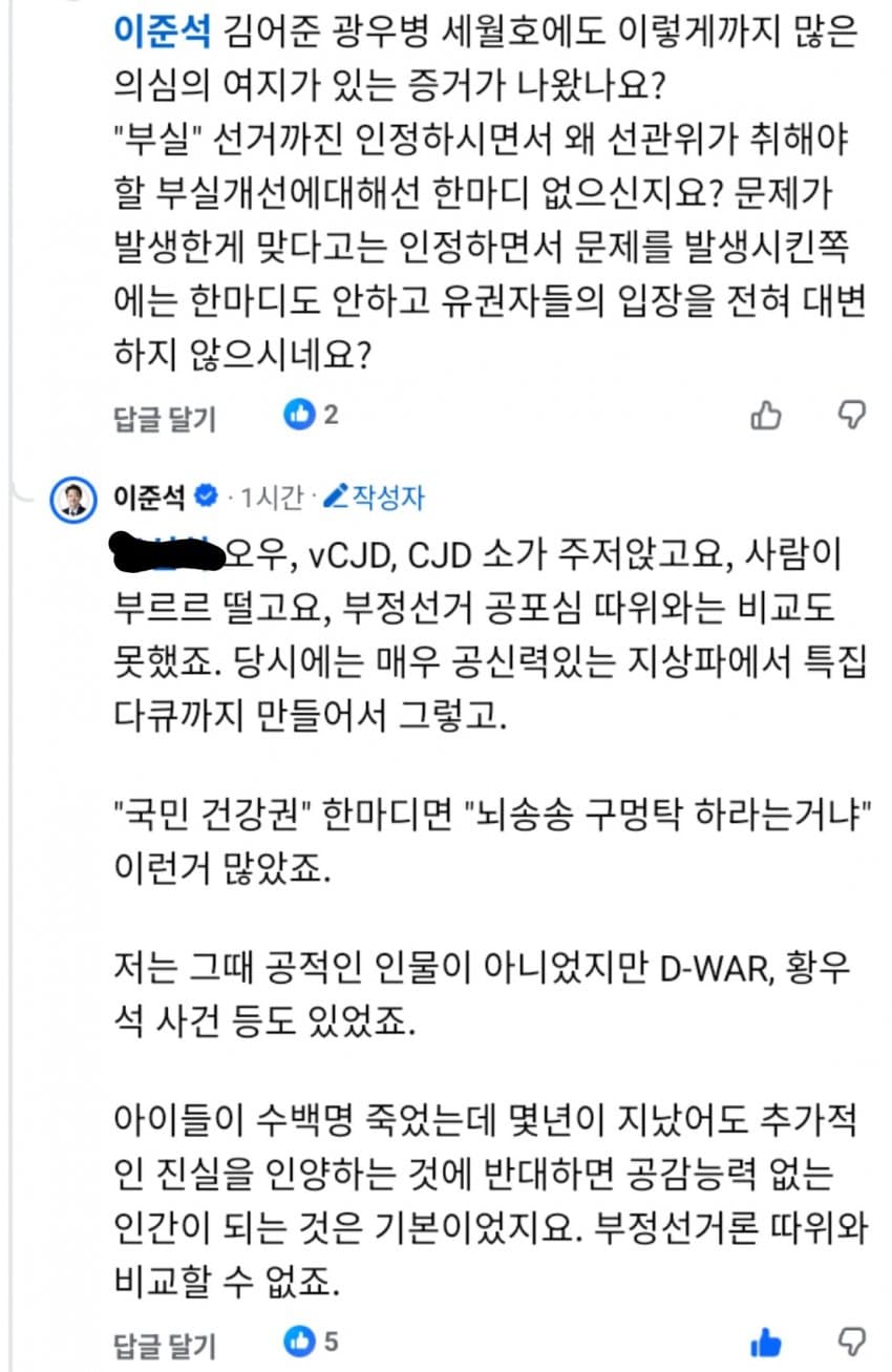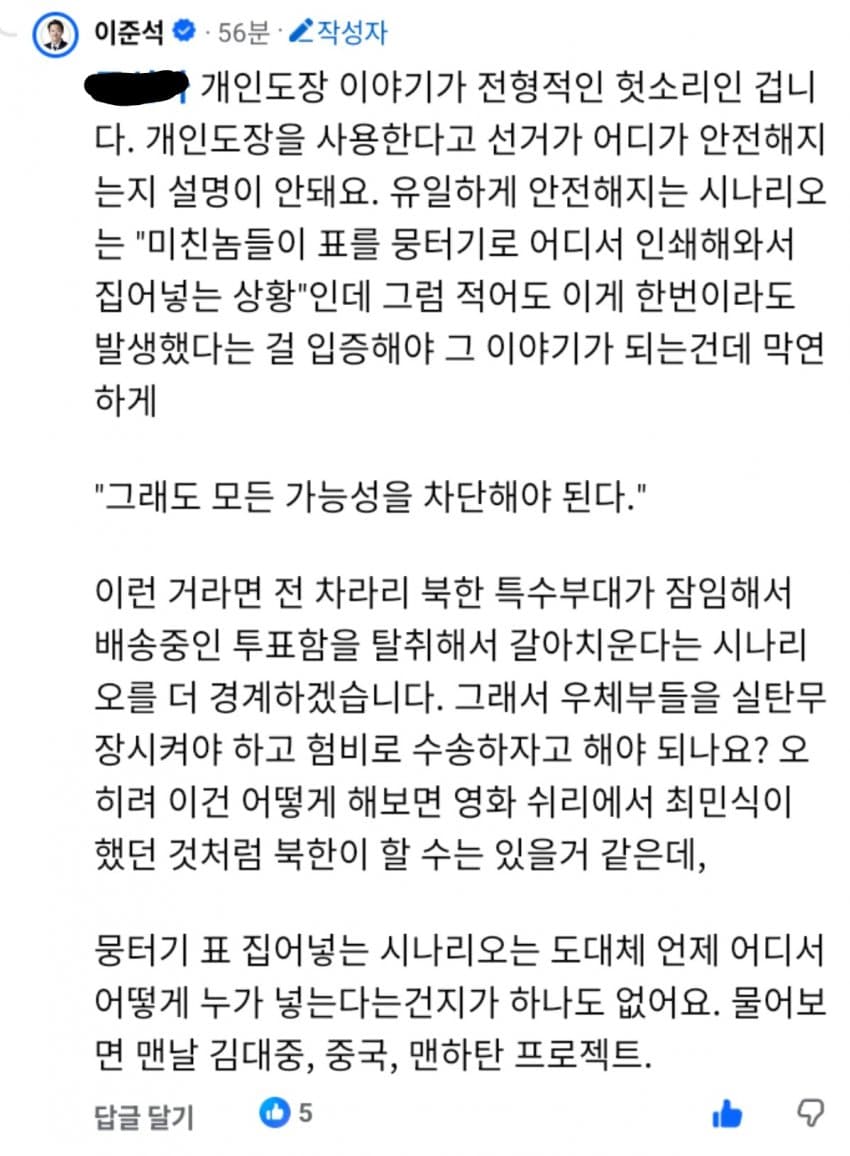 이준석 : 부정선거 없다 선거는 완벽하다전한길 : 의심가는 정황이 많다 검증해보자이준석 : 검증도 수사도 감사도 안된다 완벽한 증거를 제시해라ㅋㅋㅋㅋㅋㅋㅋ