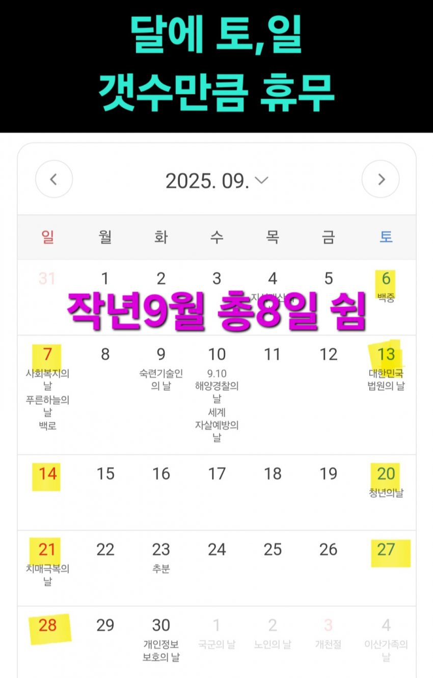 주말 이틀은 나포함 다른 근무자들도 그렇게는 절대 못쉬고 월에 주말개수만큼 8일을 쉰다는거지 토,일 주말을 쉰다는게 아님3일 근무->1일 쉼 이런식으로 반복해서 8번쉰다는거