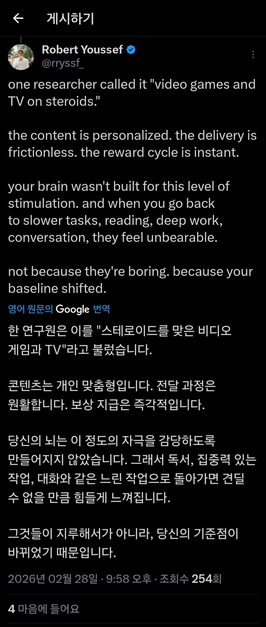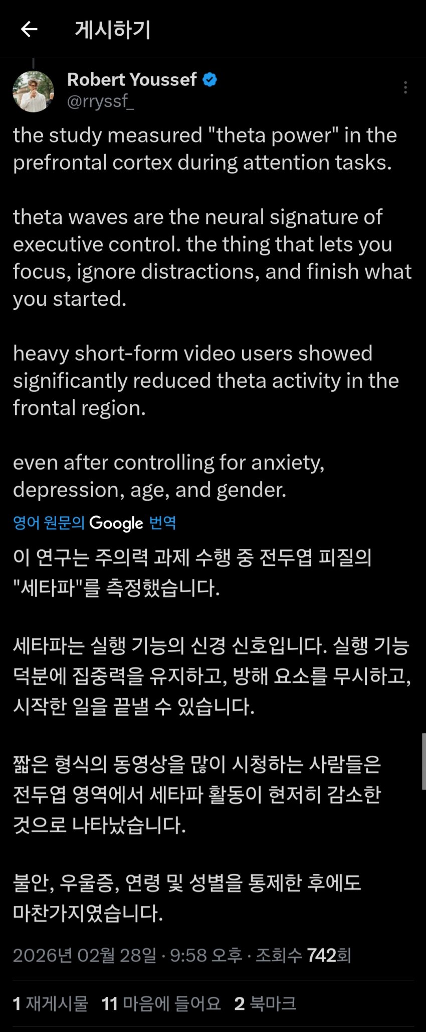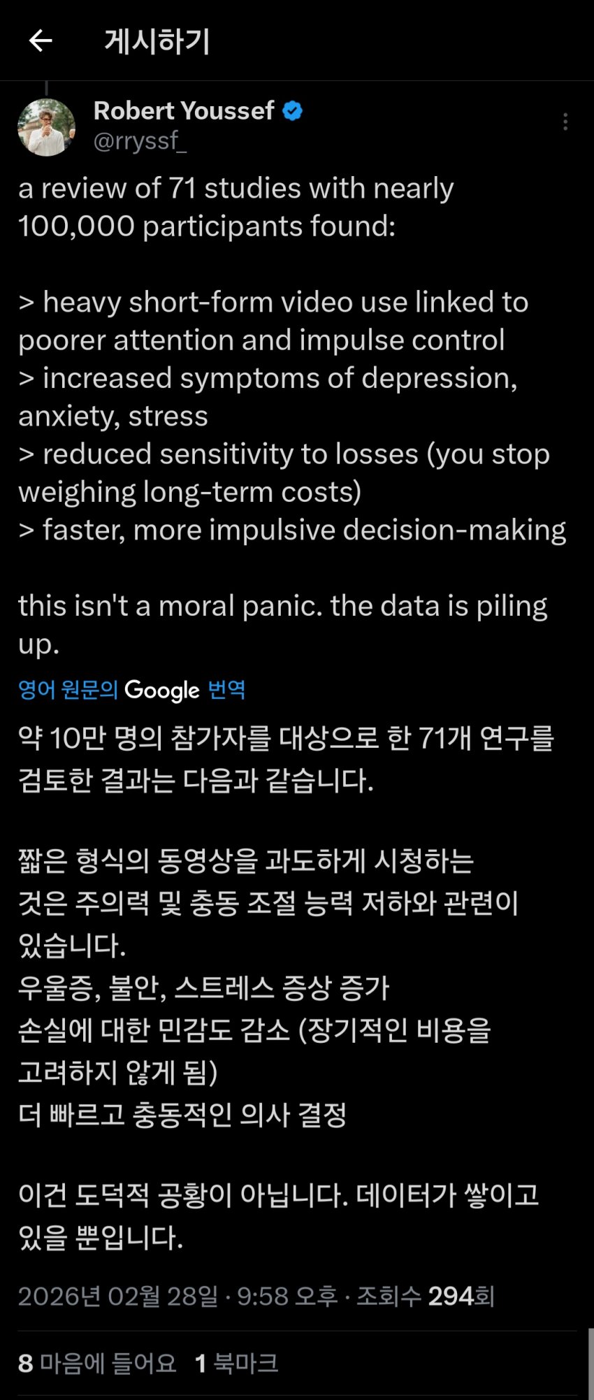 요새 쇼츠 자주 보긴 하는데 보기 전에도 좀 기분이 울적하고 그랬는데, 쇼츠보면 더 심해진다는 건가? 그럼 엑스도 마찬가지임? 쇼츠보단 덜 하지만 마찬가지로 짧으면서 자극적이거나 혹은 여러가지 정보를 내놓잖아