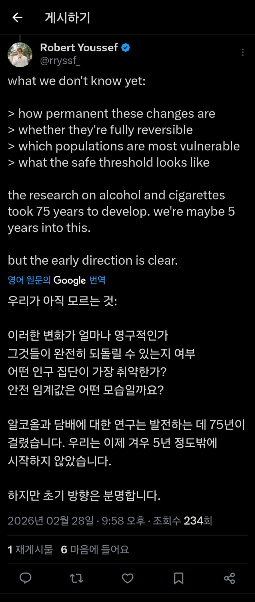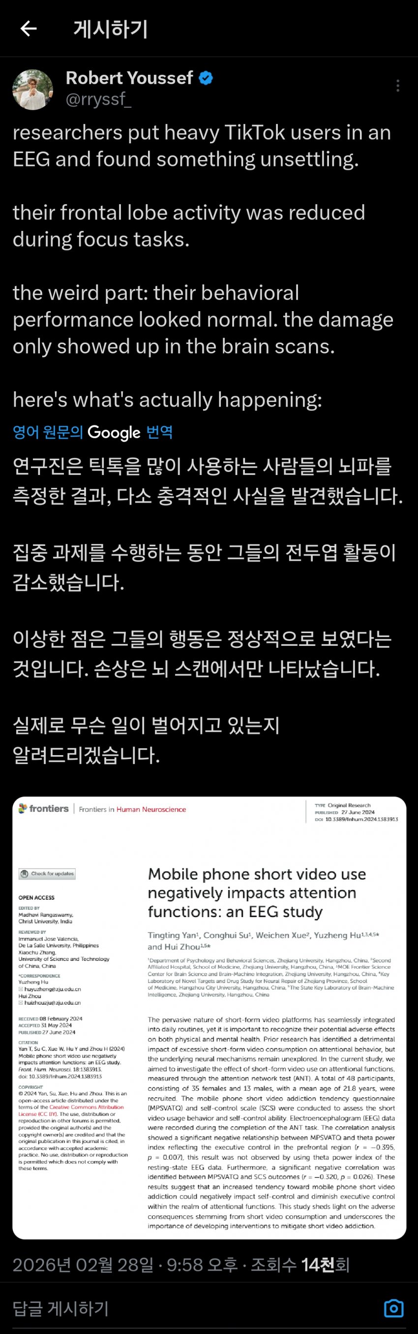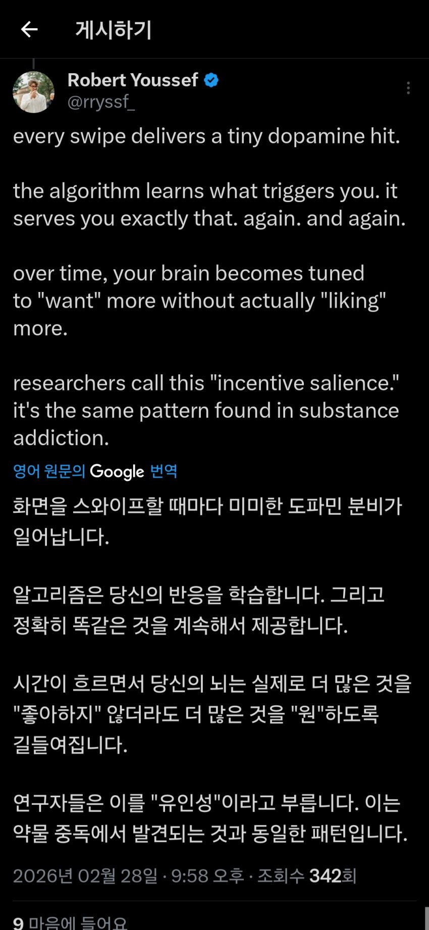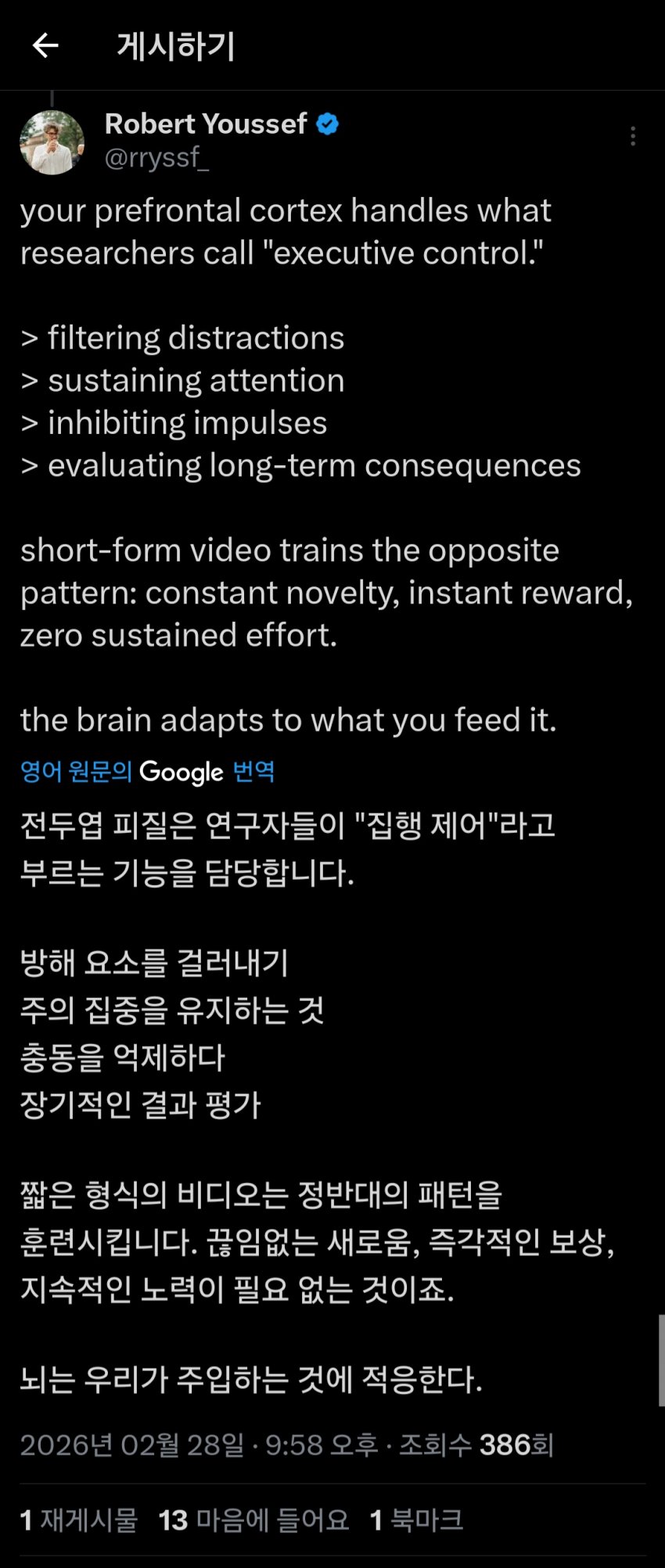 요새 쇼츠 자주 보긴 하는데 보기 전에도 좀 기분이 울적하고 그랬는데, 쇼츠보면 더 심해진다는 건가? 그럼 엑스도 마찬가지임? 쇼츠보단 덜 하지만 마찬가지로 짧으면서 자극적이거나 혹은 여러가지 정보를 내놓잖아