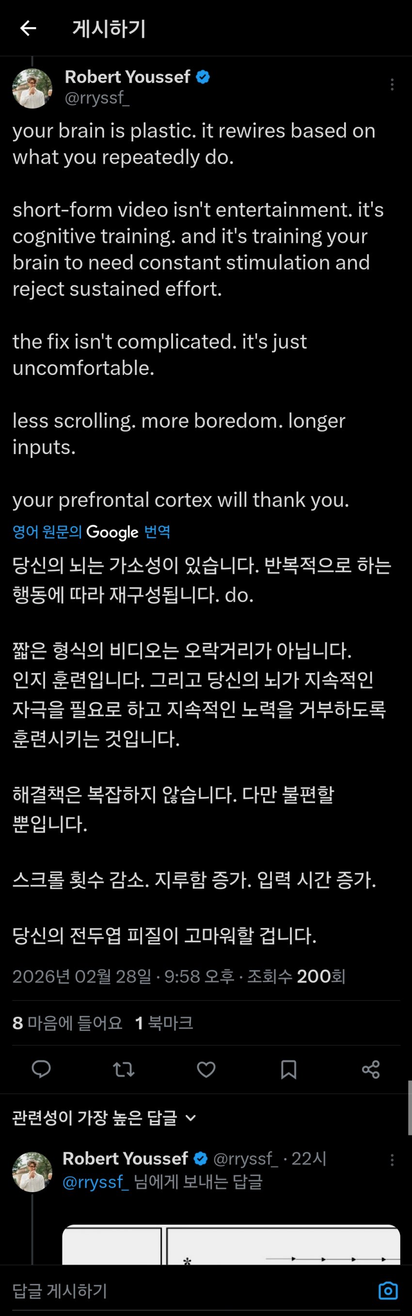 오늘부로 유투브 쇼츠 보면 사람이 아니다 ㄹㅇ 일론 머스크처럼 핸드폰을 하루에 4분만 사용하던가 해야지
