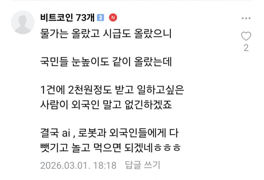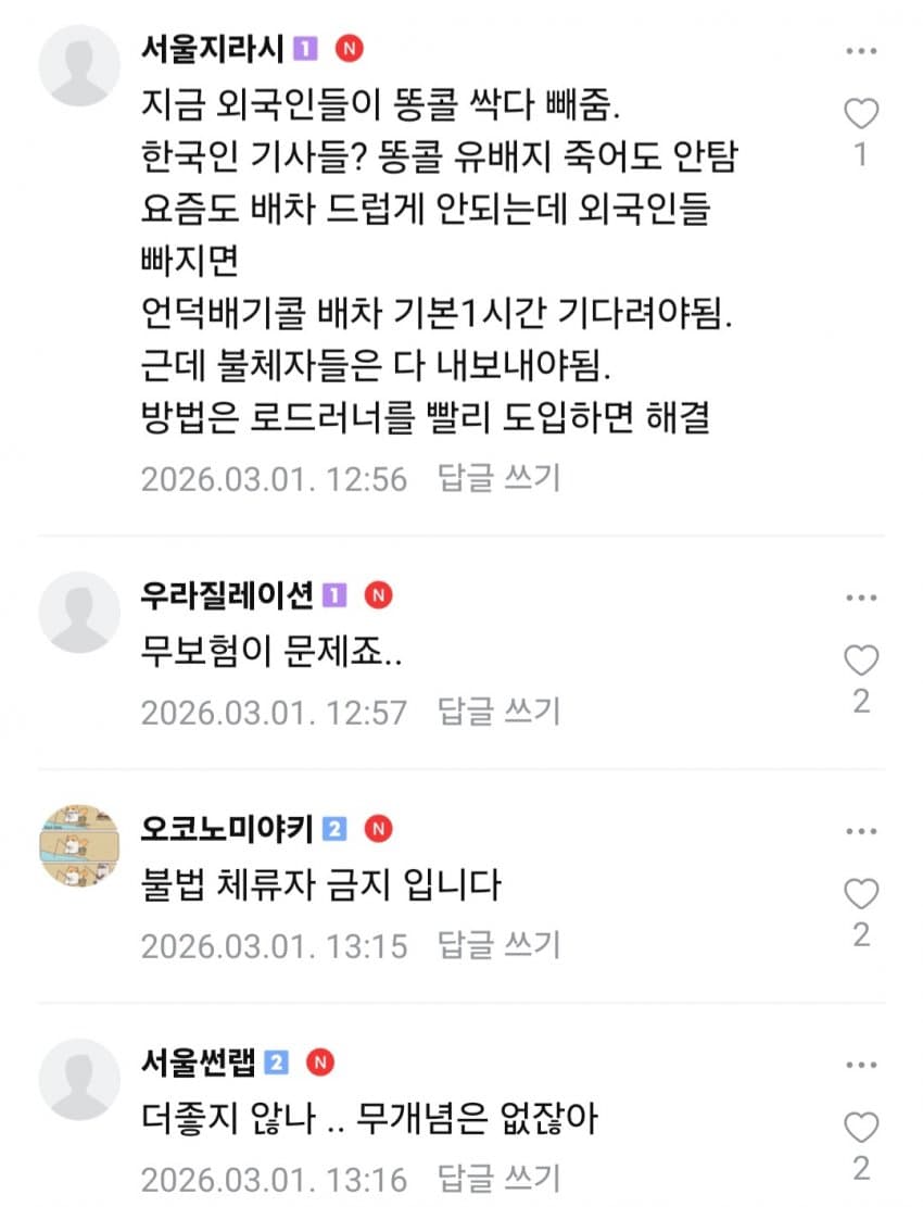 배달 빼고는 이미 외국인 노동자들이 다 장악해서 오히려 외국인 십장 외국인 반장들 눈치보면서 들어가서 일해야 됨. 얼마 전 예능에서 연예인들 대거 투입해서 농촌 일손돕기 체험 찍었는데 딱 연예인들+촬영팀 빼고 그냥 한국인 최고관리자 1명 빼고 전부 다 외국인 노동자들. '계절노동자분들이 도와주셔서 우리가 이 방송도 찍을 수 있는거'라고 하면서 설설 김. 가르쳐 주는 사람들도 전부 외국인 노동자들. 한국출연진들 일 못한다고 계속 혼남. 그래도 감사한 분들이라고 이분들 덕에 우리나라가 돌아가는 거라고 계속 그러던데 나도 어느정도는 인정하지만 그래도 도시에서 중간이하 한국인들이 먹고 살 수 있는 유일한 길인 배달만큼은 좀 지켜줘야 되는 거 아닌가 싶음. 주말에 오산 밑으로 지하철 탑승객도 거의 다 외국인 노동자들