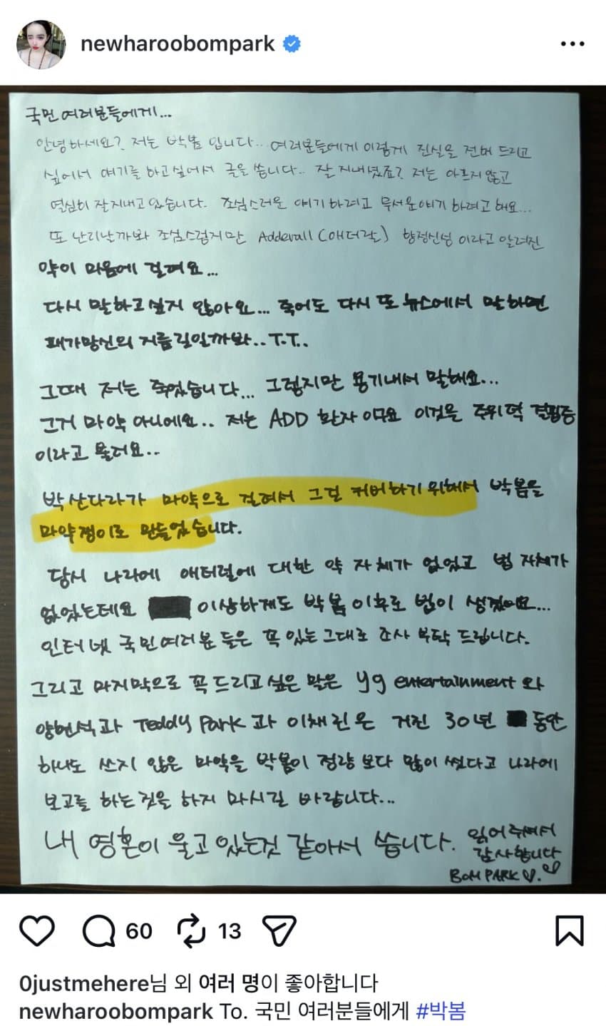 박봄 또 사고침 산다라언냐 마약했다고 글올림