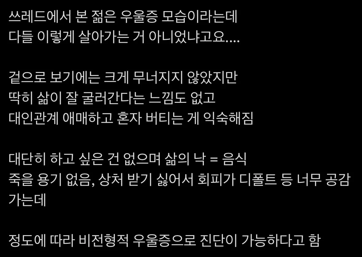 ㄹㅇ 저정도 가지고 우울증은 진짜 개쌉소리고 오히려 걱정거리 없고 마음이 편하면 저럴수있음