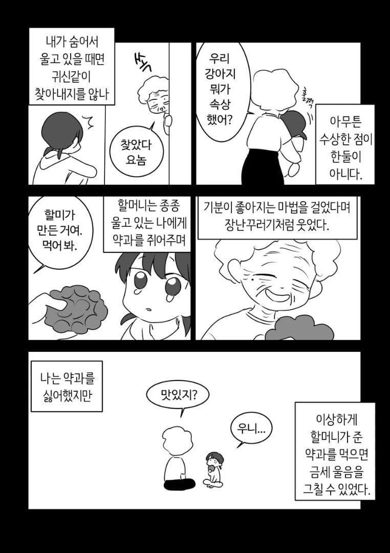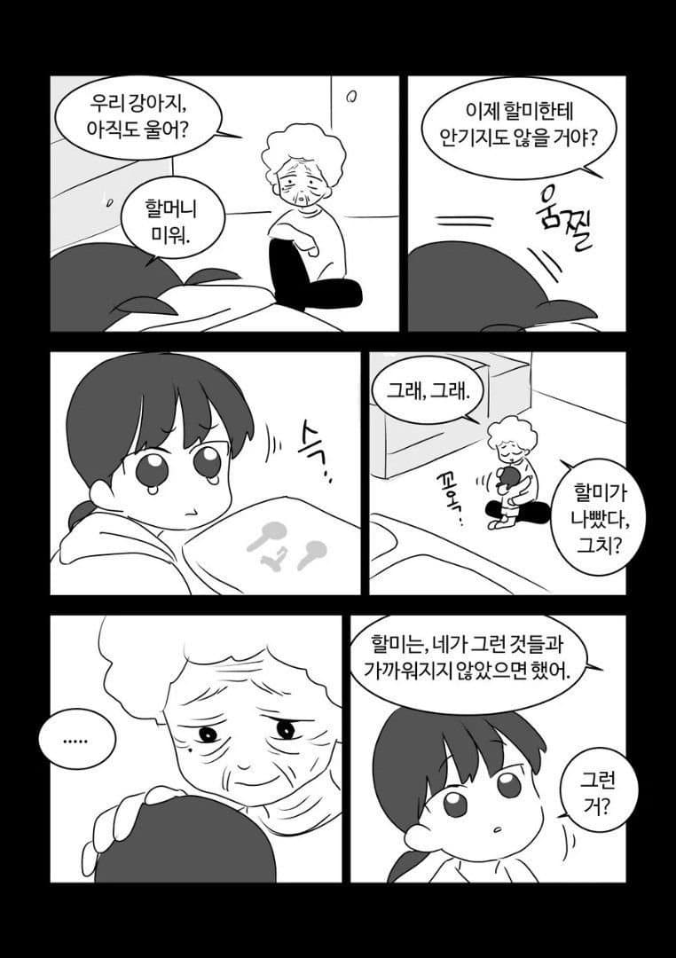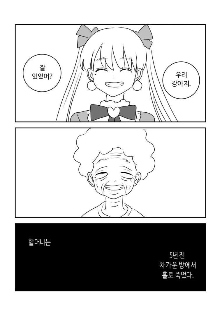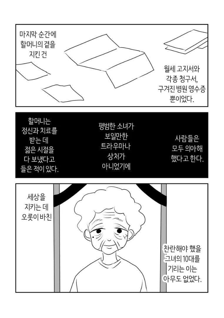 뭔가 억지로 끼워맞추다가 앞뒤가 다 꼬인듯 할머니는 제대로된 젊은생활을 못보냈는데 애도낳고 손녀도있고 자식이랑 손녀가 자주 놀러올정도였는데 죽은건 또 버려진 고독사노인같이 표현하고