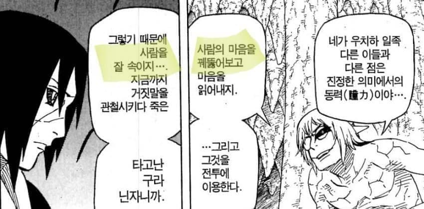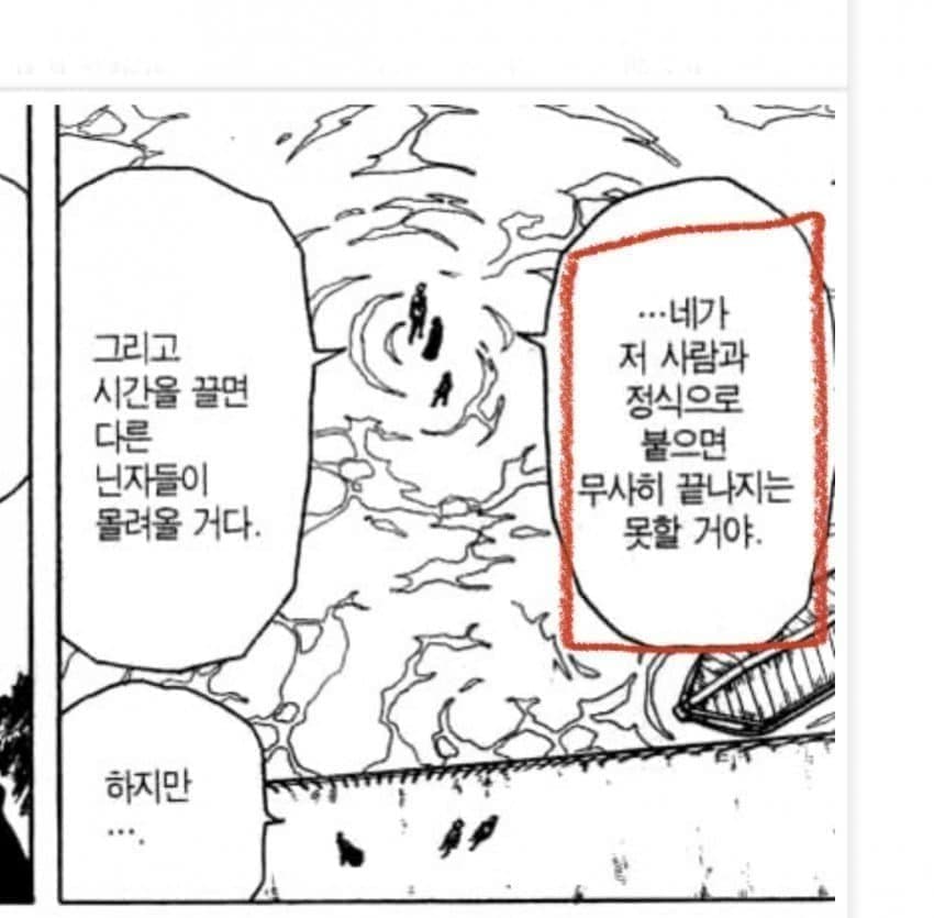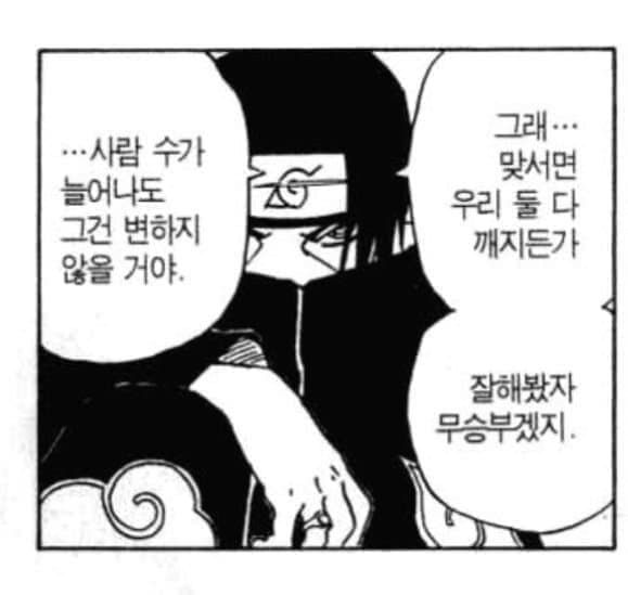 이 대사를 보고 지라이야 혼자서 이타치 + 키사메 + 다른 아카츠키원 다굴을 이길 수 있다는 주장이 많음