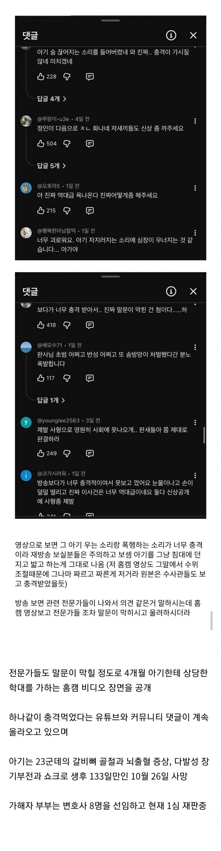도저히 이해가 안가는사건이라 산후우울증 맞긴하겠지. 아니면 새아빠 , 남친도 아니고 지배아파서 자기 남편사이에서 낳은 아이를 4개월만에 폭행해서 죽일이유가 뭐가있냐진짜