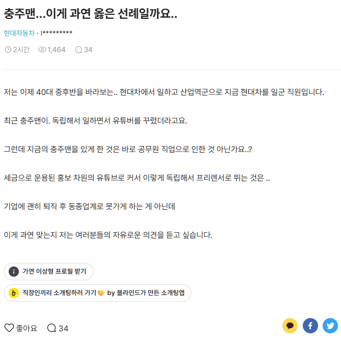 블라인드에 충주맨이 직장내 뒷담화를 꾸준히 당해왔다는 내부 폭로글이 게시됨