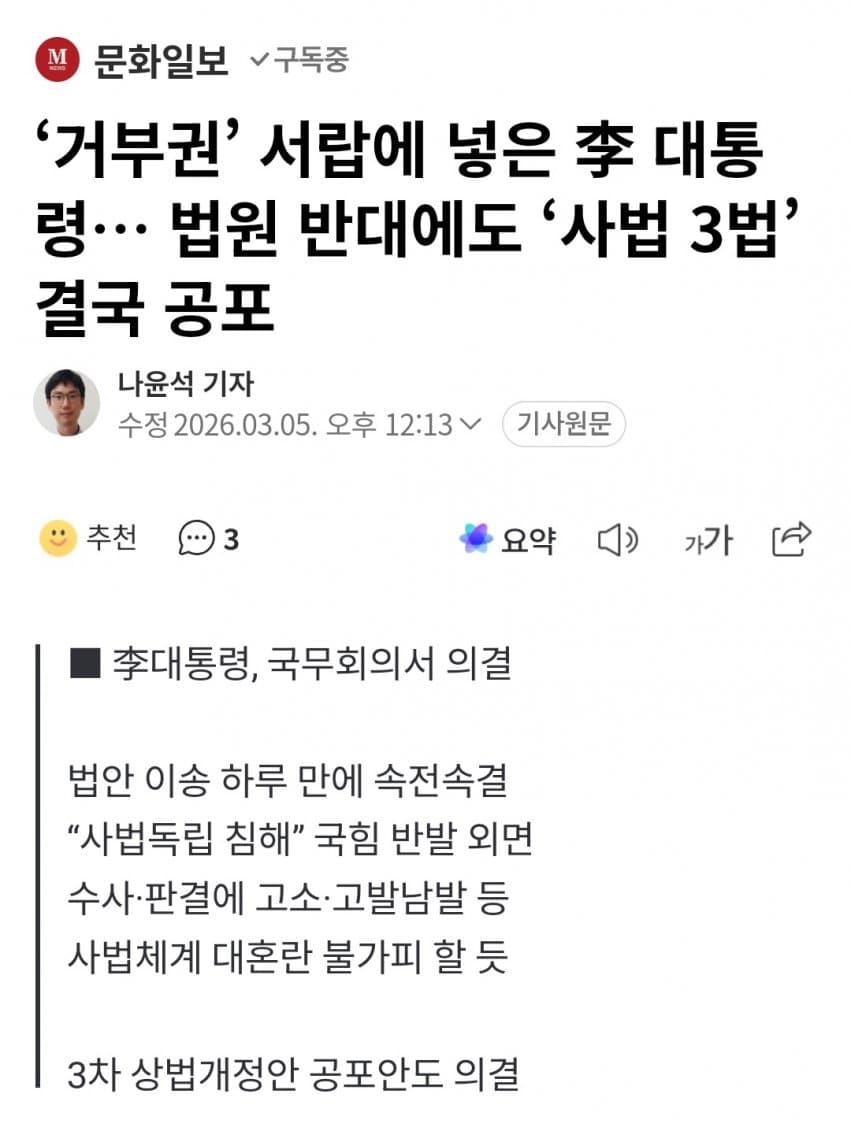 ‘거부권’ 서랍에 넣은 李 대통령… 법원 반대에도 ‘사법 3법’ 결국 공포