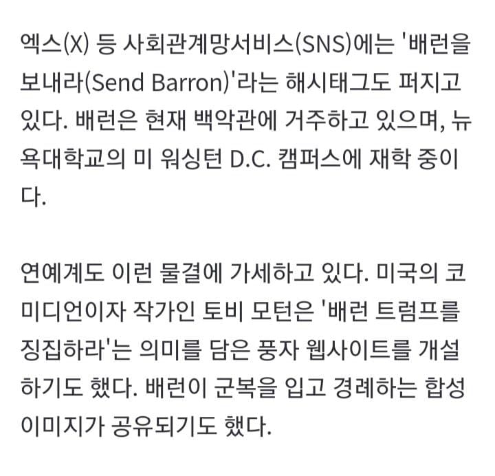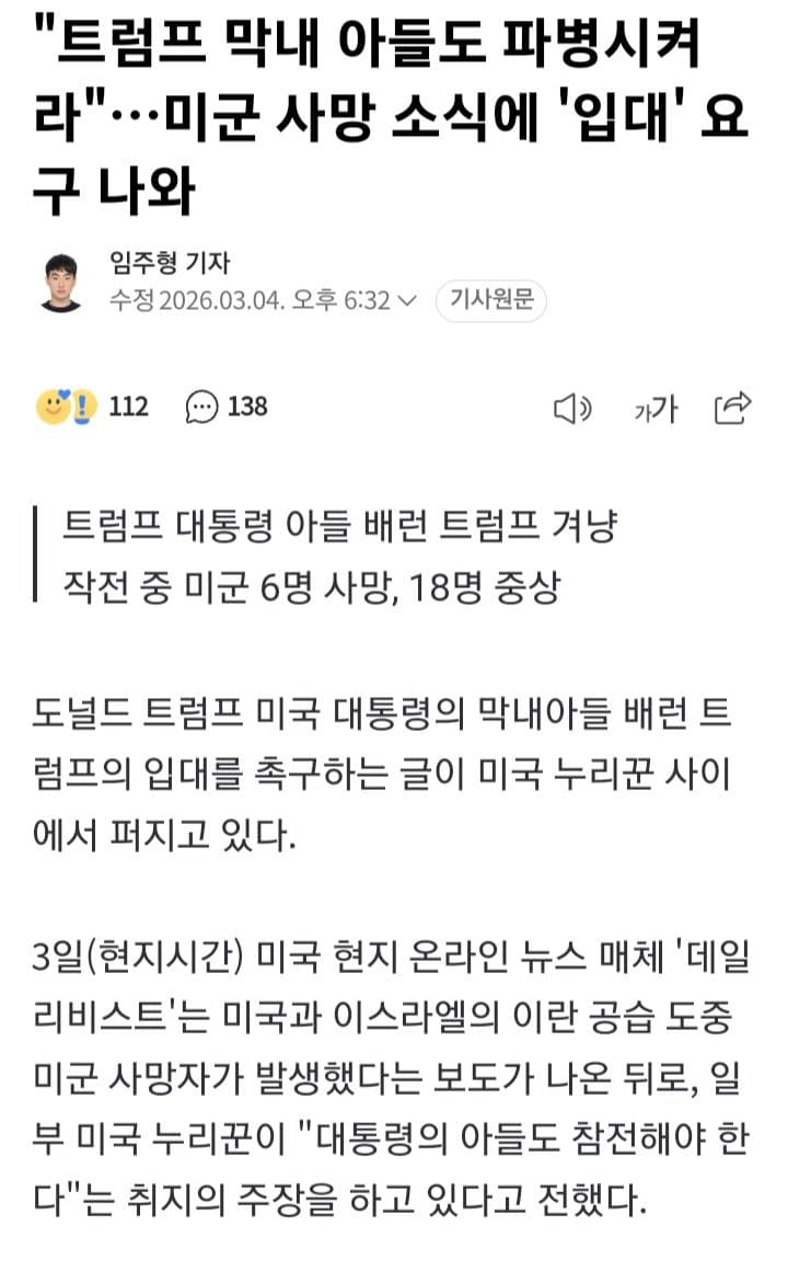 "트럼프 막내 아들도 파병시켜라"…미군 사망에 '입대' 요구