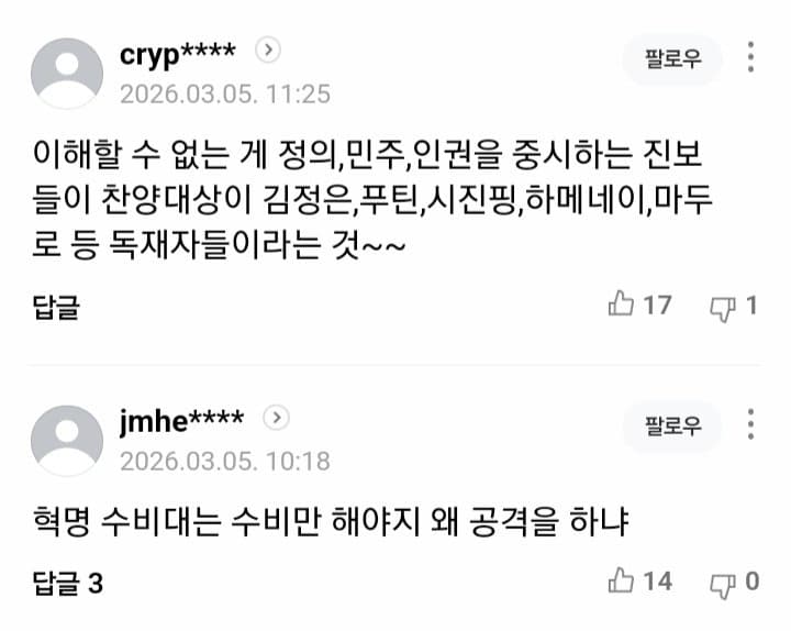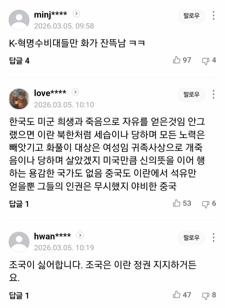 ㄹㅇ ㅋㅋ 미네소타에서 차로 공무원 밀다가 총맞고 죽은 사람은 세상에서 가장 귀한 목숨이 죽은 거지만, 민주주의를 위해 시위하다가 학살당한 3만 이란 시민들은 그딴거 알빠노 때리는게 개 역겨움 그냥 절대 악은 이란이고 미국을 욕할거면 그걸 왜 니네가 하냐에서 멈춰야지 무슨 미국, 트럼프가 이란보다 더한 순수악인거마냥 선동때리더라