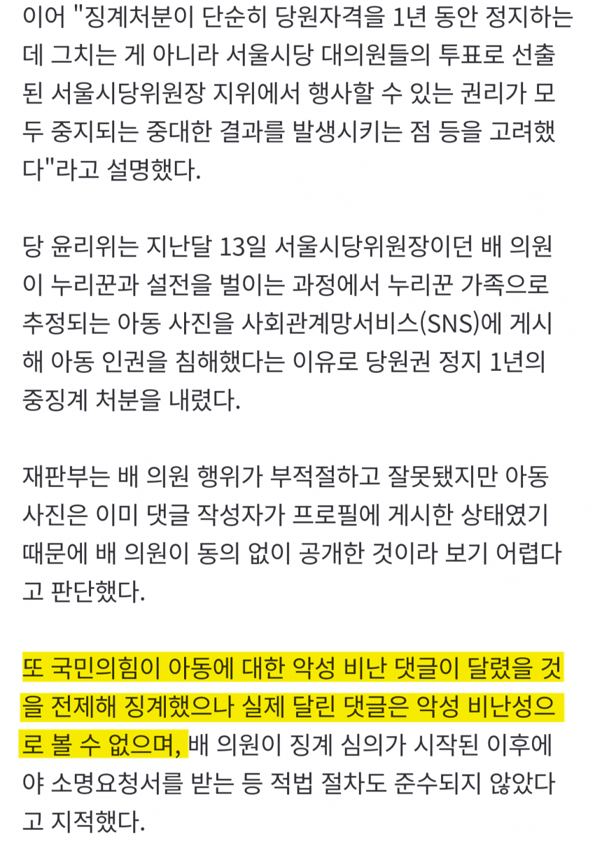아동 사진을 '무단 게시'한 것 그 자체만으로도 징계 사유에 해당돼 징계받은건데 왜 댓글 내용을 따짐?