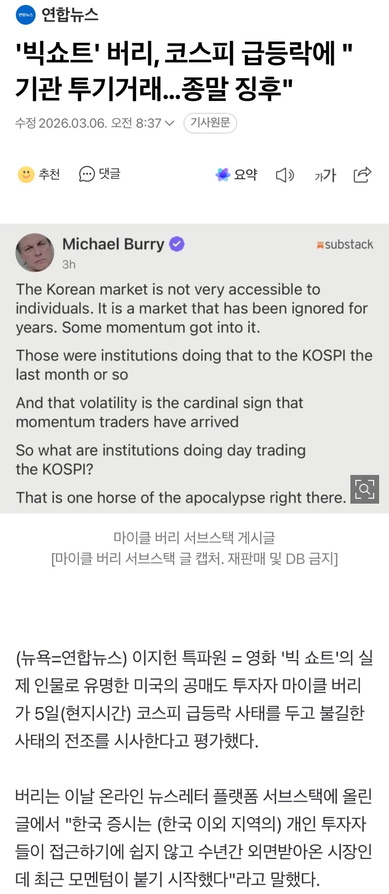 마이클 버리, 코스피 급등락에 "종말 징후"