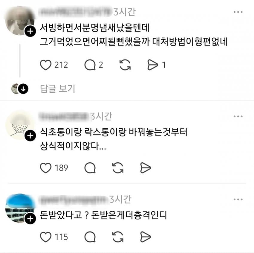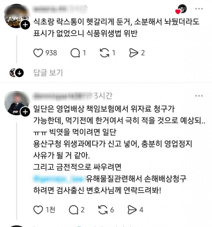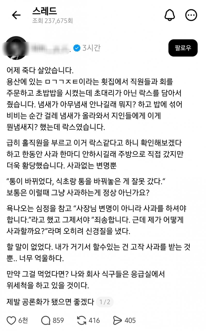 가게가 분명히 잘못한건 맞음근데 피해입은게 없음에도 불구하고 사과 이상의 뭔가를 원한다는건 좀 과한 욕심임안먹었으면 다행이다 하고 환불이나 쳐하고 나오던가사과가 아니라 금전적인 보상, 돈을 원한다고 솔직하게 씨부리던가