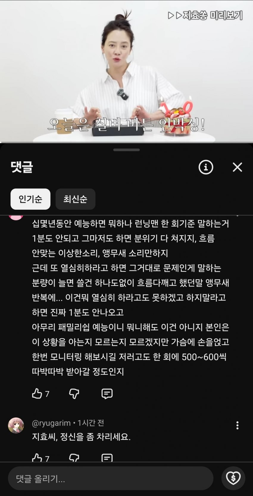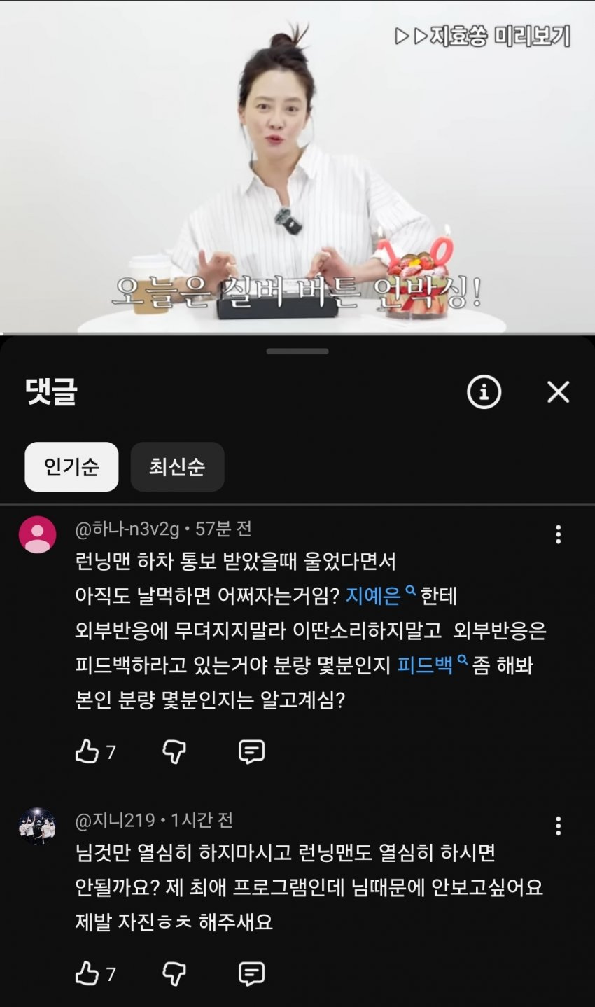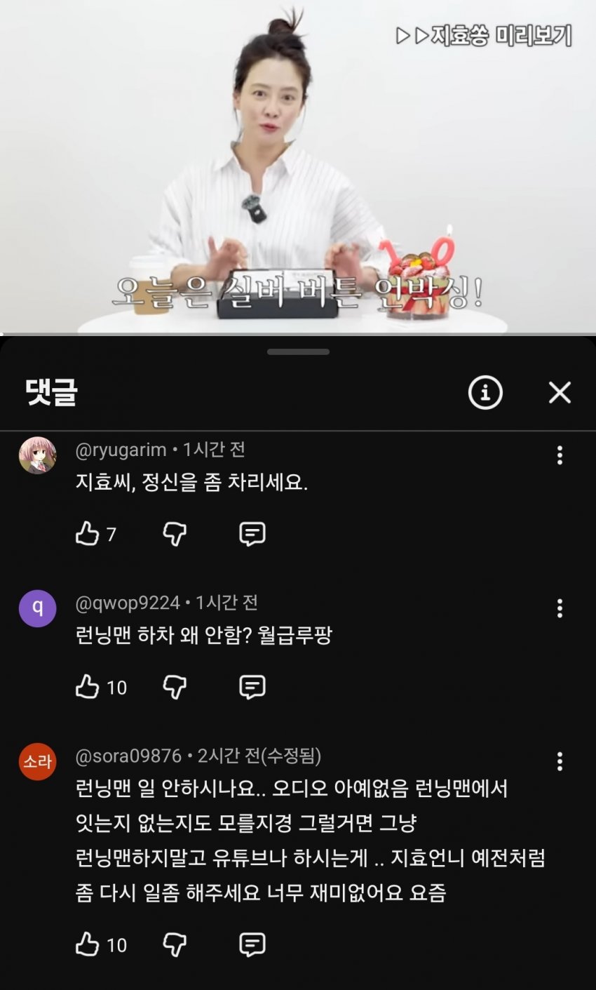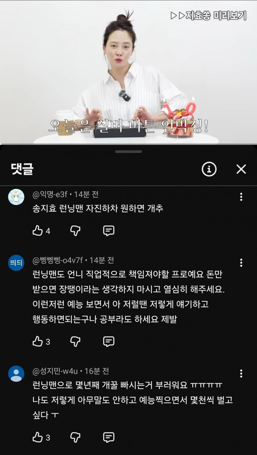 런닝맨 아직도 해? 송지효 문제가 아니라 그냥 런닝맨 자체를 폐지 해야 하는 것 아니냐?? 그리고 뭔가 저렇게 몰려가서 댓글 쓰고 바로 바로 커뮤에 올라오는 것 보면 ㅈㄴ 의심스러움