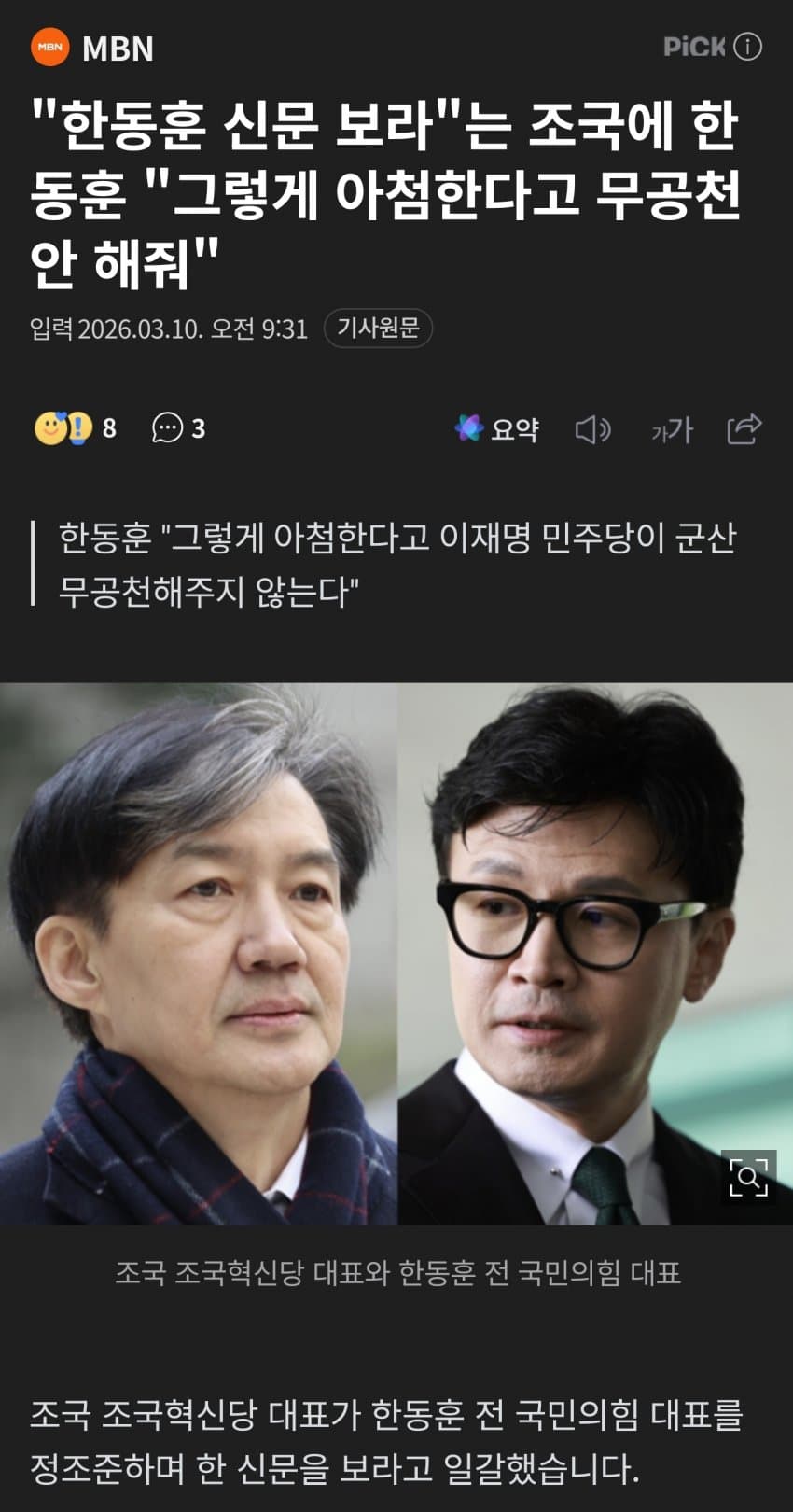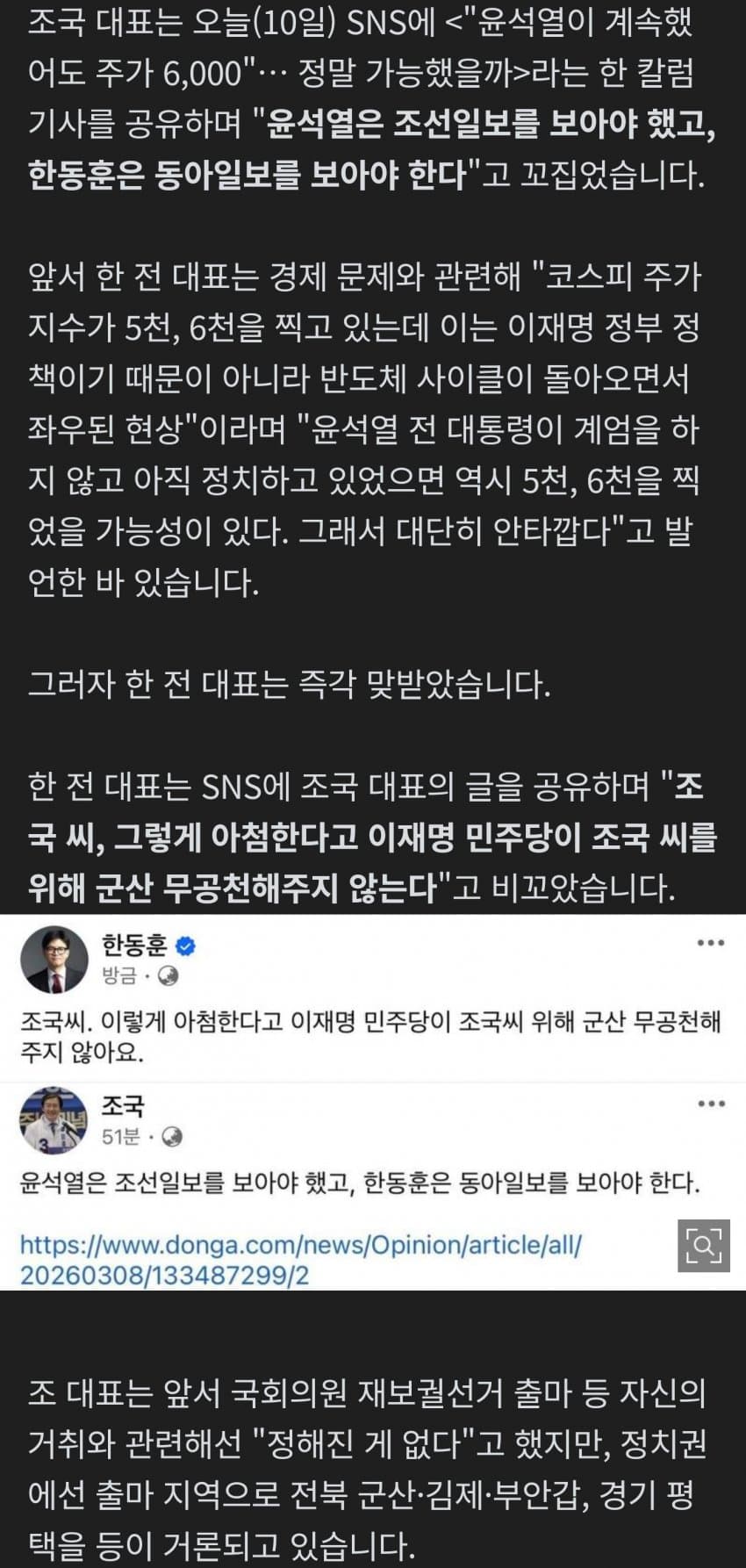 "한동훈 신문 보라"는 조국에 한동훈 "그렇게 아첨한다고 무공천 안