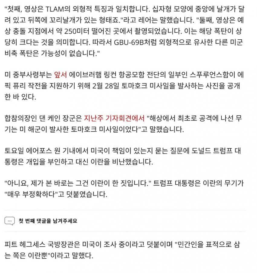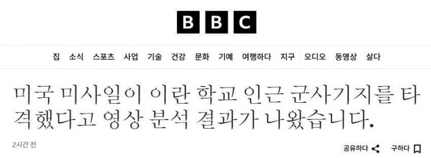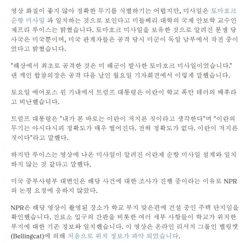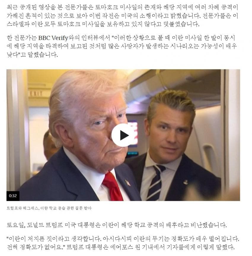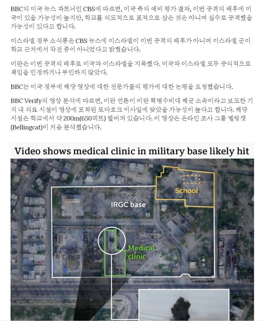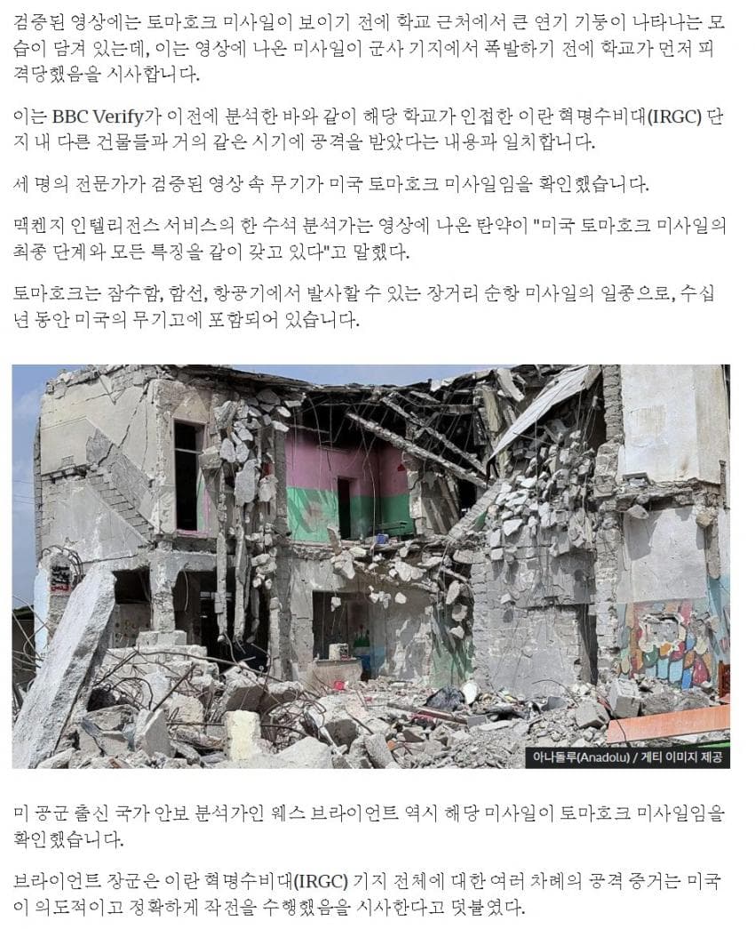 BBC자문 군사 무기 전문가 "미군이 쏜 토마호크 맞음. 해당지역에 여러차례 공격이 가해졌는데, 이란 미사일로는 이렇게 못함."