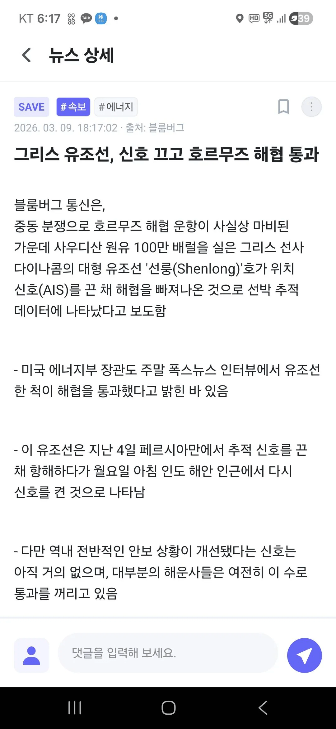 팩트체크 ) 선명: Shenlong (IMO 번호: 9379210) 선박 종류: 수에즈막스(Suezmax)급 유조선는 3월 4일 신호기를 끄고 3월 9일 인도해상인근에서 신호기를 켯다. 트롬프는 3월 9일 용기내서 통과하라고 했다. 즉 글쓴이의 "트럼프 말 듣고 용기내서 해협 통과함" 는 날조이다