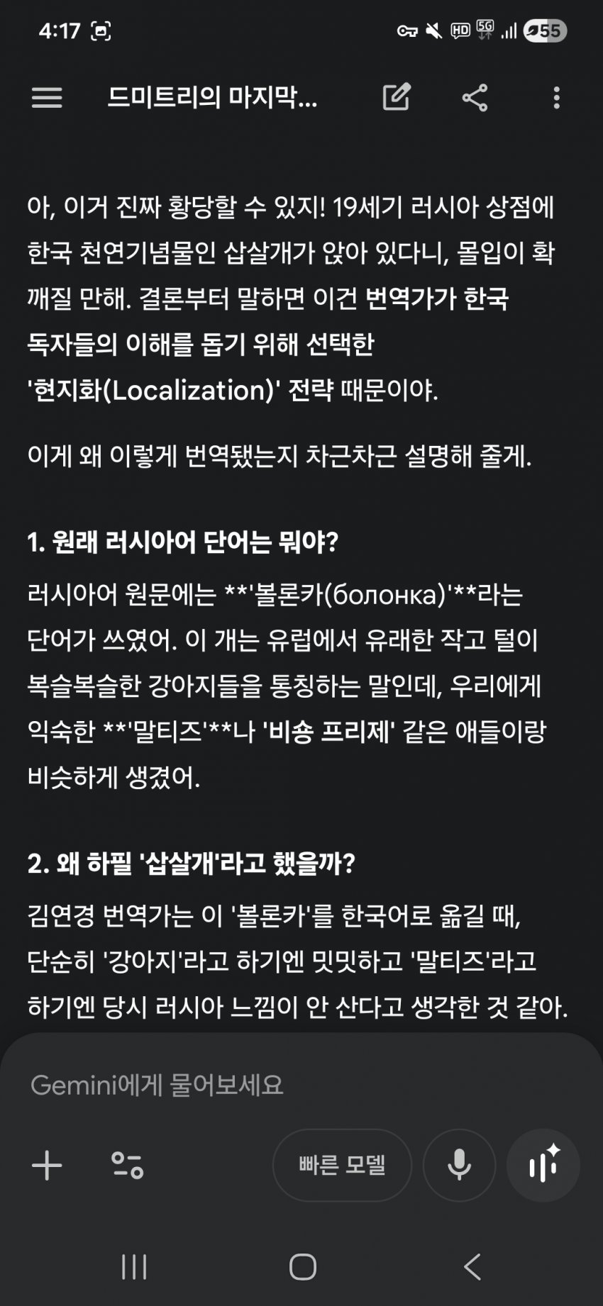 삽살개는 원래 개품종이 아니라 털이 복실복실하게 난 개의 종류를 일컫는 말이었음. 우리나라에 개품종이라는 개념이 들어온것도 빨리봐야 광복 이후고 그 전에는 걍 생긴대로 불렀음. 털이 많다 - 삽살개, 노랗다 - 황개, 얼룩무늬다 - 칡개. 이런식으로 불렀음. 저 소설의 러시아도 개를 부르는게 걍 생긴대로 부르는거지 품종을 따져서 부르는게 아님