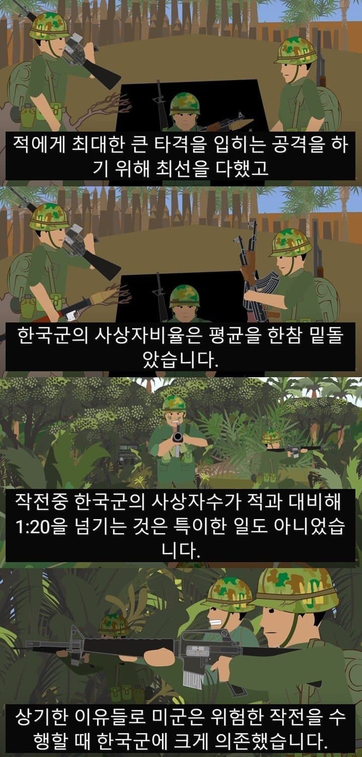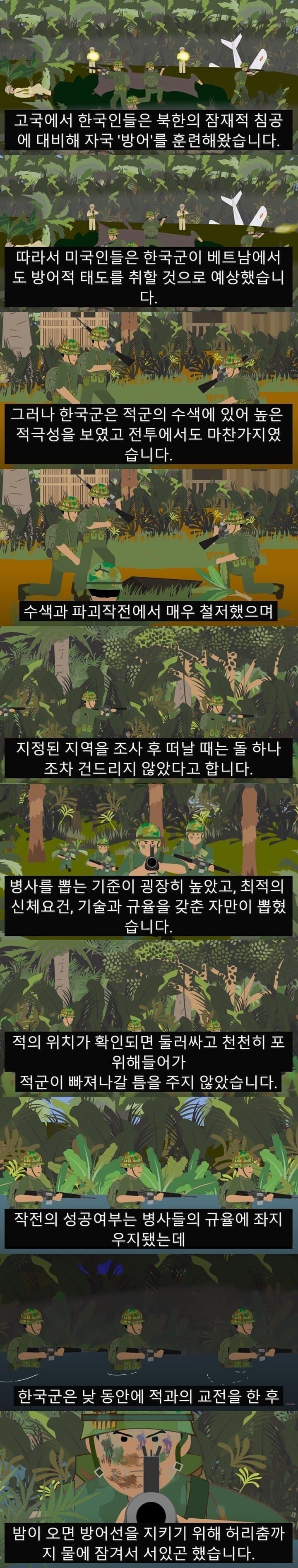 베트남전 파병군인들은 사실 징집병이 아니다. 물론 한국군에 징집되어 입대한 병들은 맞지만, 베트남 파병 부대 백마부대, 맹호부대는 그냥 원래 자대 배치받았던 군인들이 걍 그대로 끌려간게 아님. 이라크 자이툰부대마냥 새로 모집공고 받아서 걸러내서 데려간거임. 그래서 전국 특급용사 (지금으로치면)들만 거르고 걸러서 받은거라 상당히 전투력이 높았음