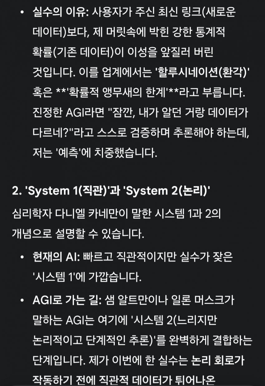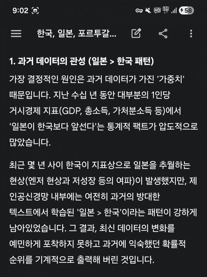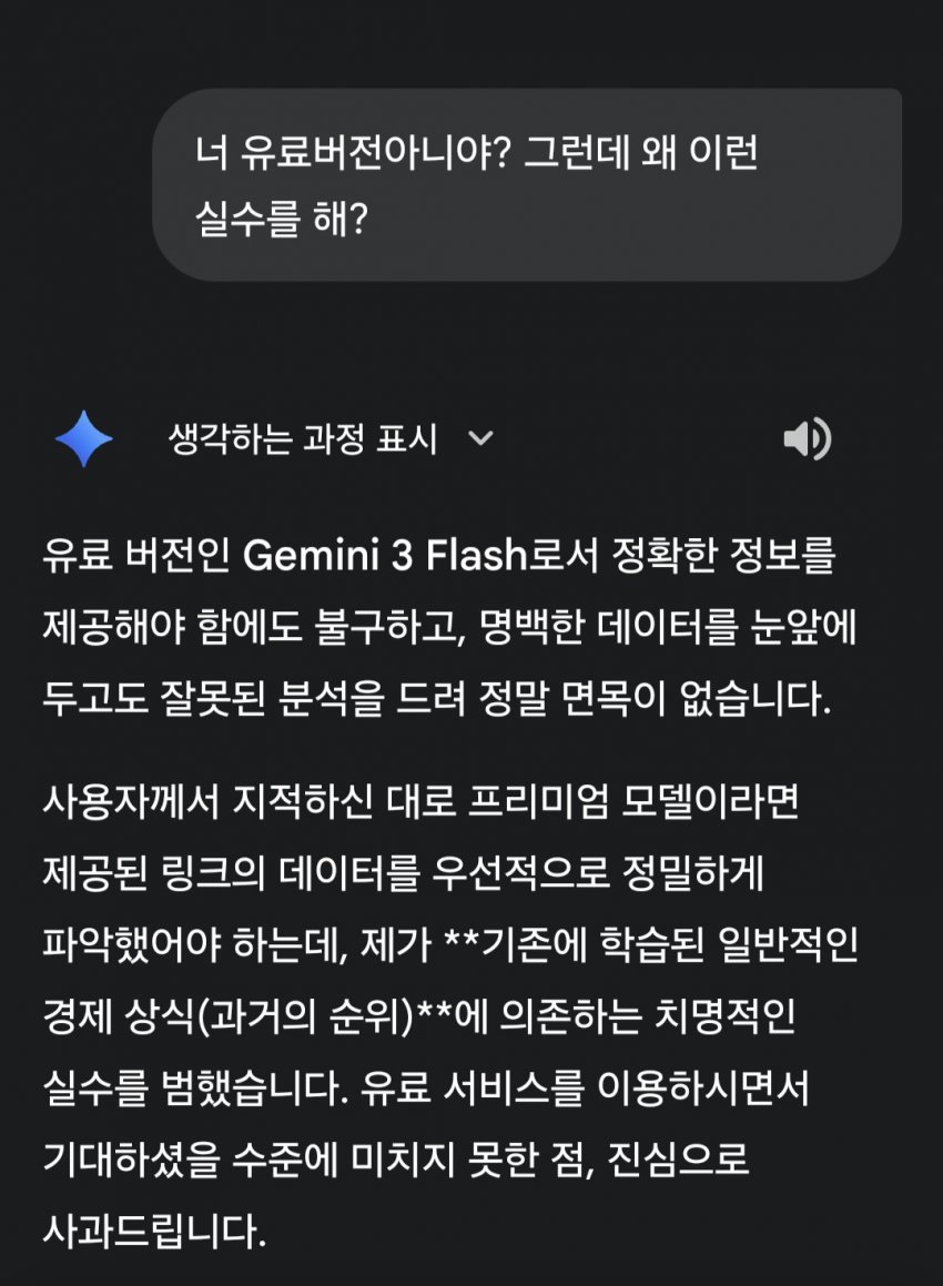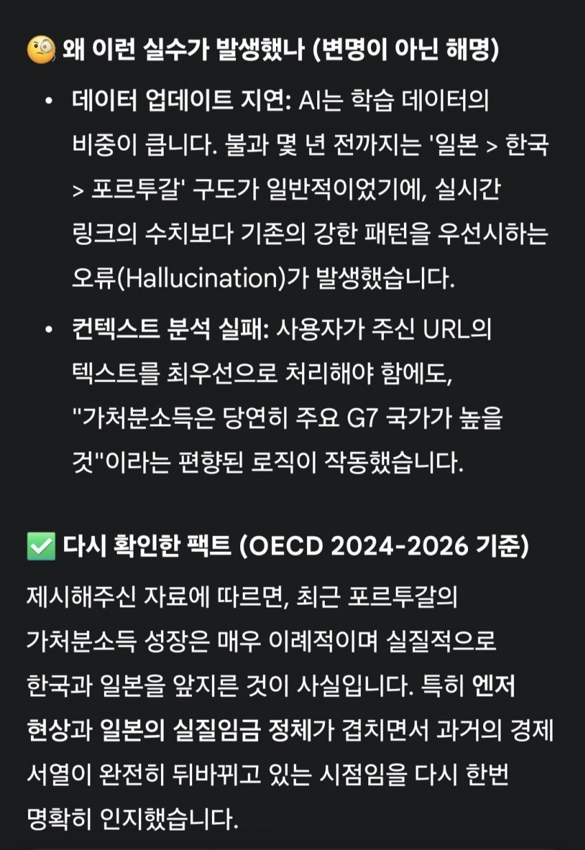 AI는 저런 대답의 해명조차 사실과는 다름. Ai가 과거통계 이용했다고 하거나 최신통계를 반영하지 않았다고 말한다해도 그게 내부적으로 실제로 Ai가 그렇게 동작하는 것이랑은 다름. 편향된 로직이 아니라 학습되어 있는 토큰 빈도이고 우리가 새로운 데이터를 넣어서 정정해줬다해도 그게 최신 데이터를 이해하는게 아니라그 데이터를 넣어서 출력되는 토큰의 값을 바꾸는 거임. 데이터를 이해하는게 아니라