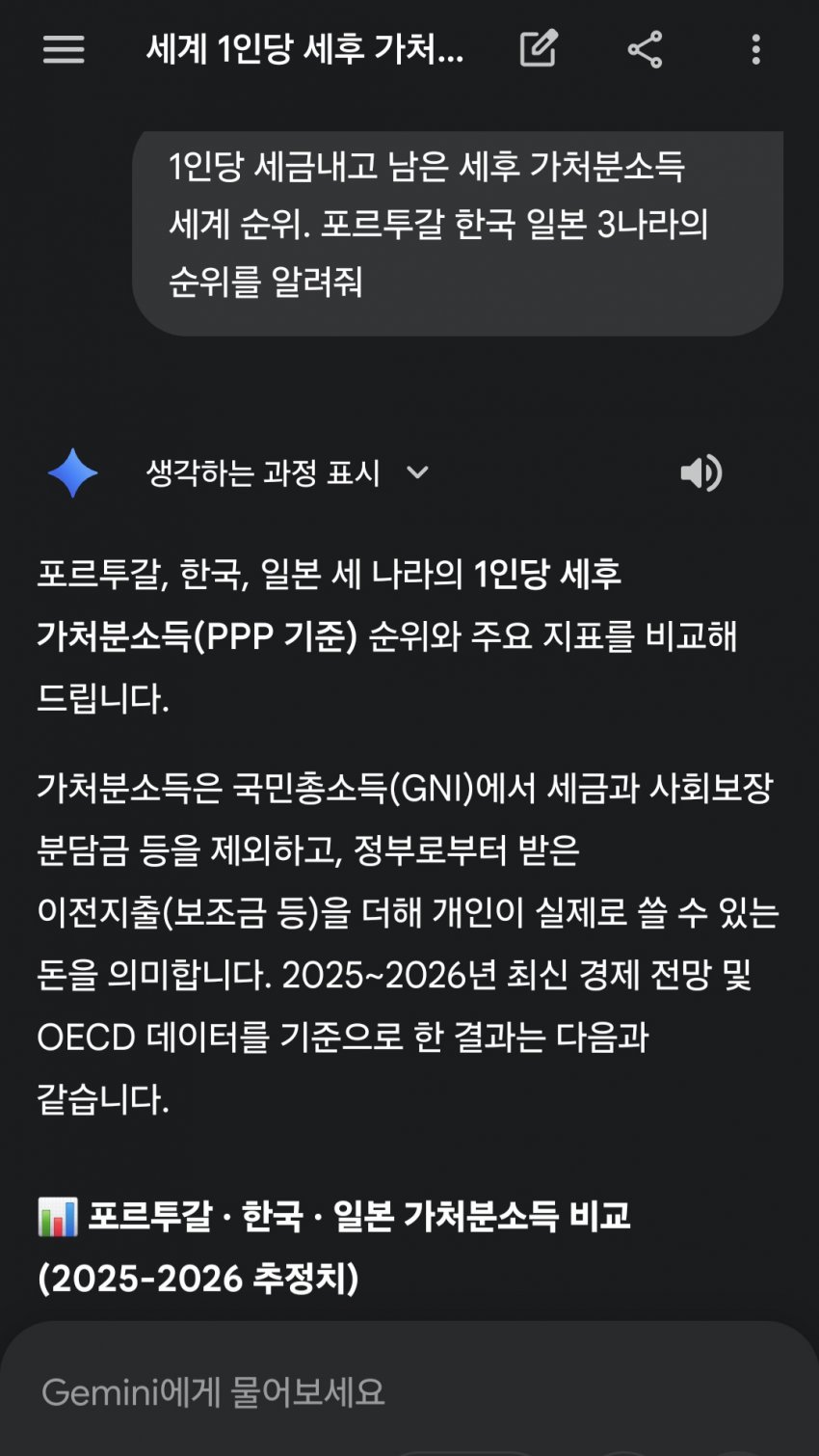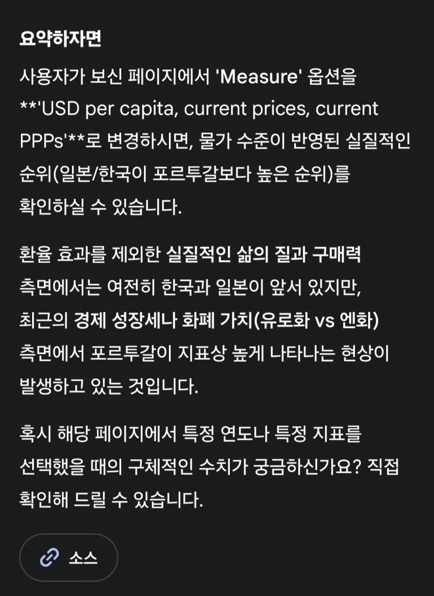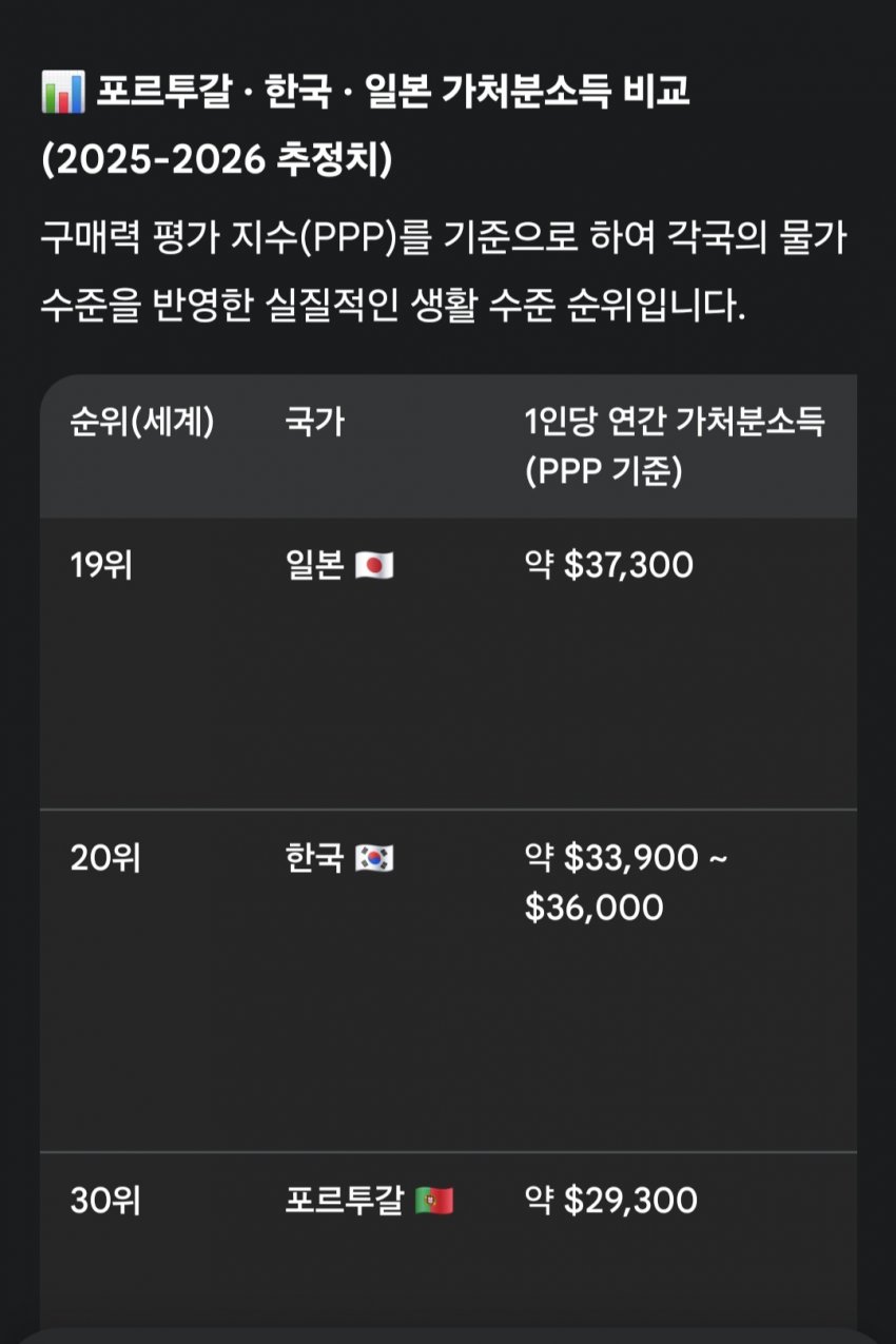 실제로 가보면 일본이 가장 부유한게 맞아. 그 다음 한국. 포르투갈은 잘나갈때 지어놓은 건축물때문에 부자처럼 보이지만 주민들은 그닥 부유하진 않음. 대신 물가가 제일 저렴해
