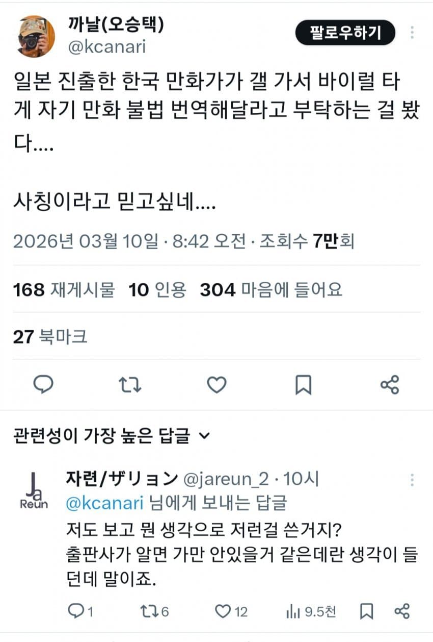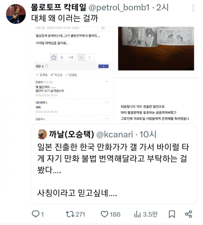 아니 애초에 저거 일본 출판사가 커뮤니티 가서 자기만화 홍보하라고 그랬다는데 걍 워딩만 불법번역 ㅇㅈㄹ 한거지 실제로는 걍 할일한거더만 지랄이노 ㅋㅋㅋㅋ