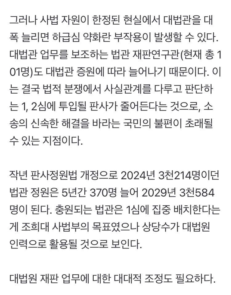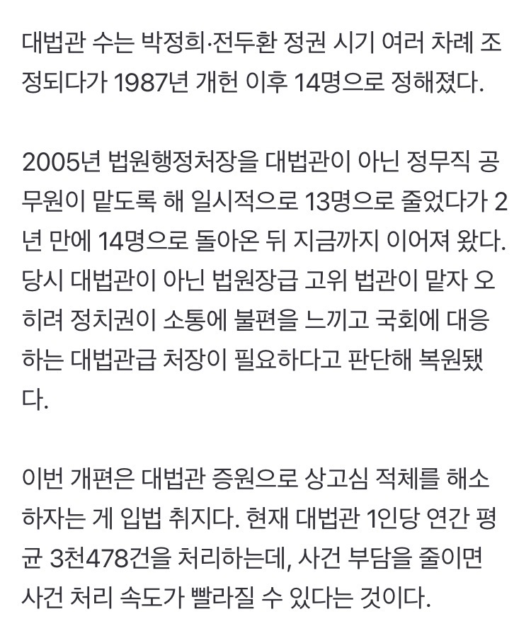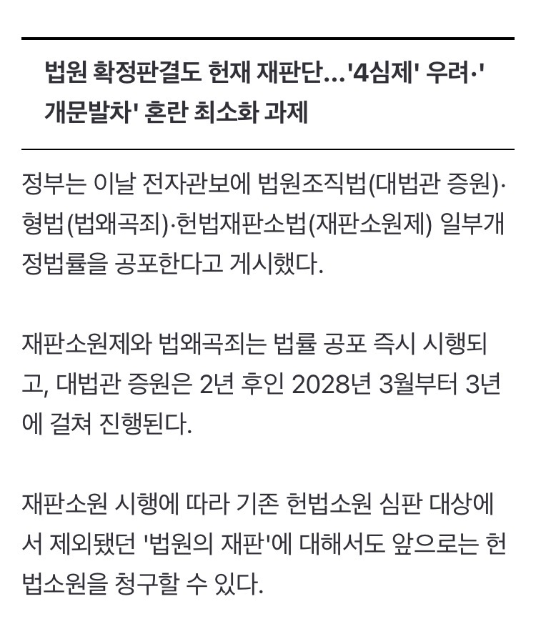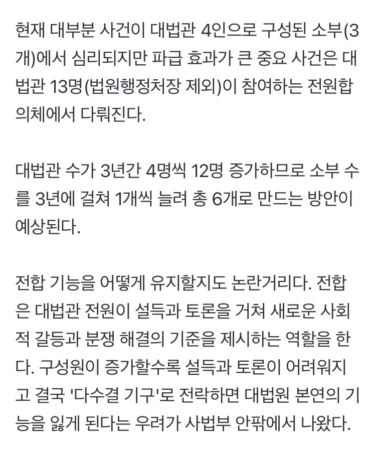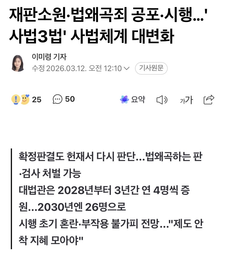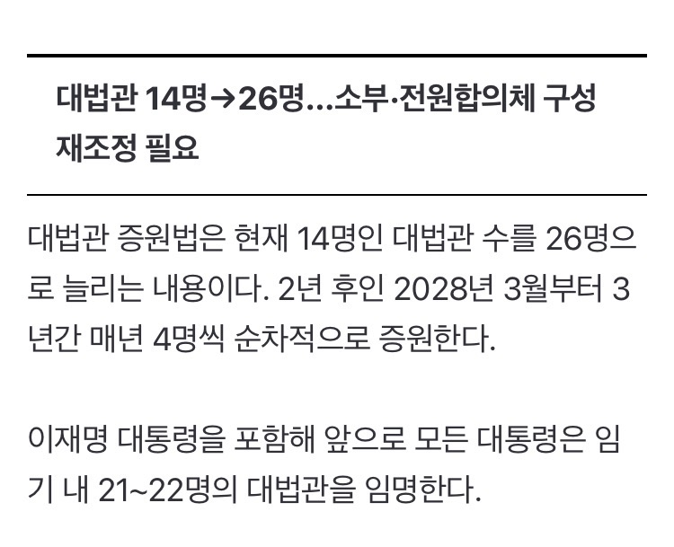 법왜곡죄는 법왜곡죄고 재판소원/대법관 증원 이 둘이 결국 충돌하게 될 것이라 본다 대법관이 적으니까 대법원 판결이 잘못된 것처럼 보일테고 2027년 재판소원 부작용 2030년 26명 되는 시점에 그 부작용이 줄어들것처럼 보임