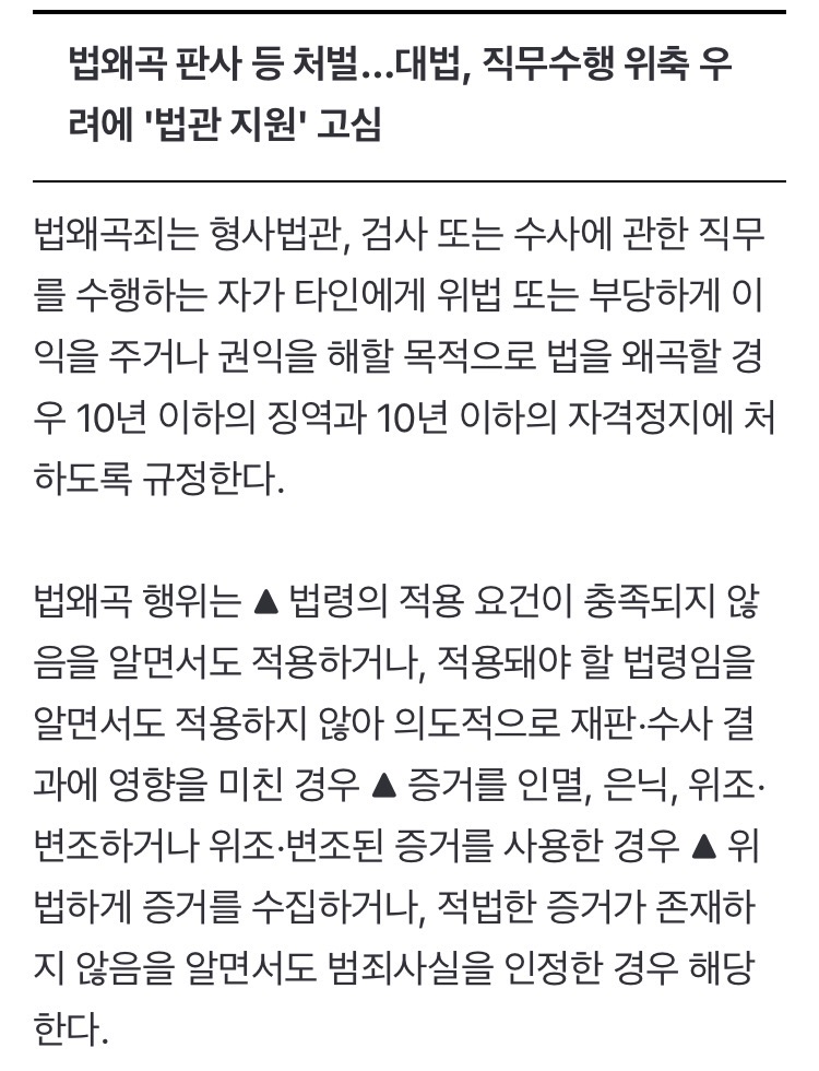 법왜곡을 판사가 판사를 판단하는건데.대놓고 위헌이라 위헌법률심판으로 폐지될거같고, 살아남더라도 판사끼리 암묵적 카르텔이 생겨 유죄판결 나오기는힘들듯
