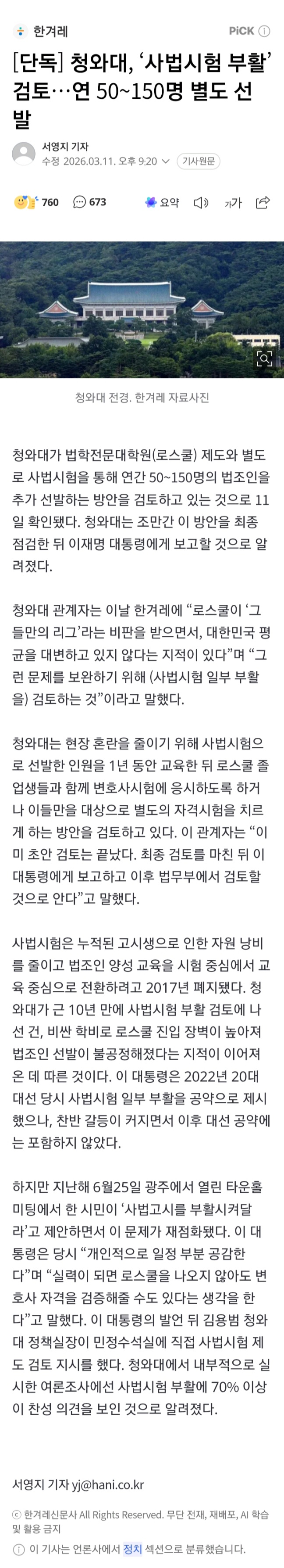 기사 자세히 읽어봐라 청와대 자체적으로 조사한 여론조사에선 70% 가 사법시험 부활에 찬성하는거로 나왔다 -국민 70프로가 찬성하는 정책은 결국 빠르냐 늦느냐 문제지 나온다
