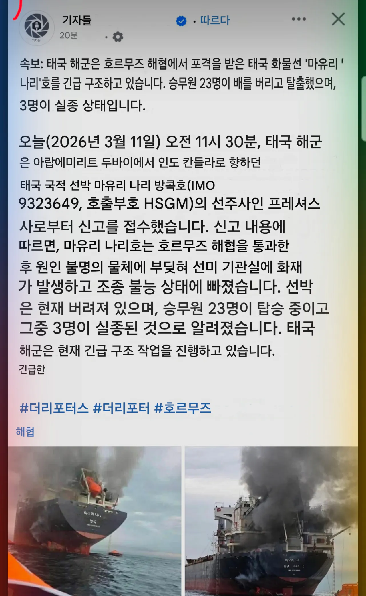 호르무즈 해협 통과중 원인 미상의 물체에 폭격당함
