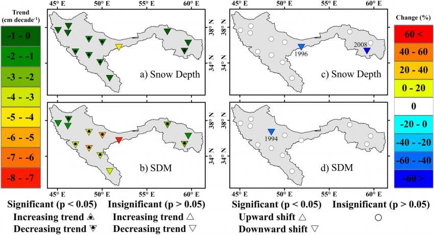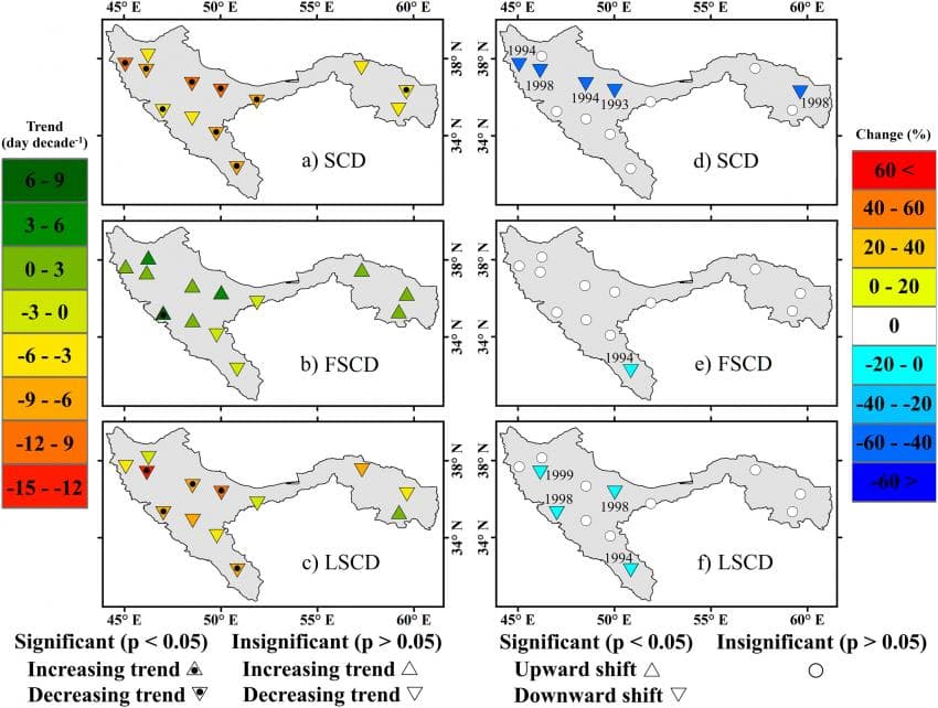 또, 전반적으로 SCD(Snow Cover Day)는 짧아졌고, FSCD(처음 눈으로 덮인 날)은 늦어졌으며, LSCD(마지막으로 눈으로 덮인 날)은 빨라졌다.