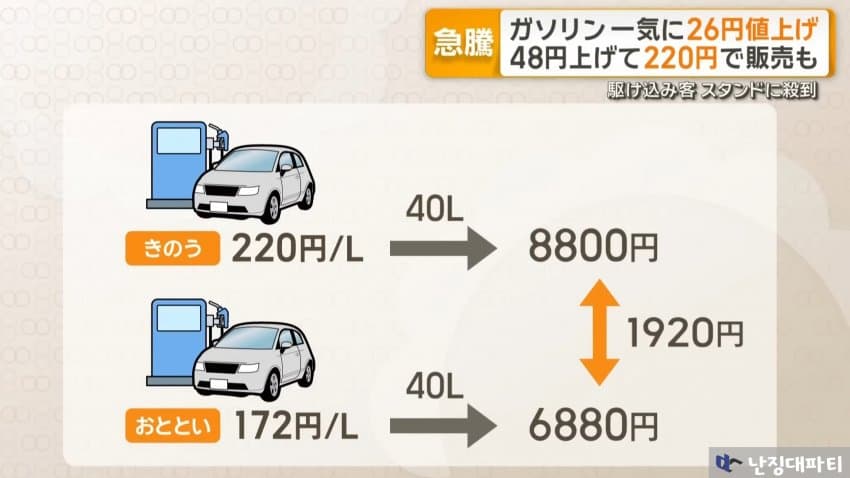 40리터 주유 기준으로 계산해보면 어제 오늘 기름 가격이 1920엔이나 차이가 나는 상황