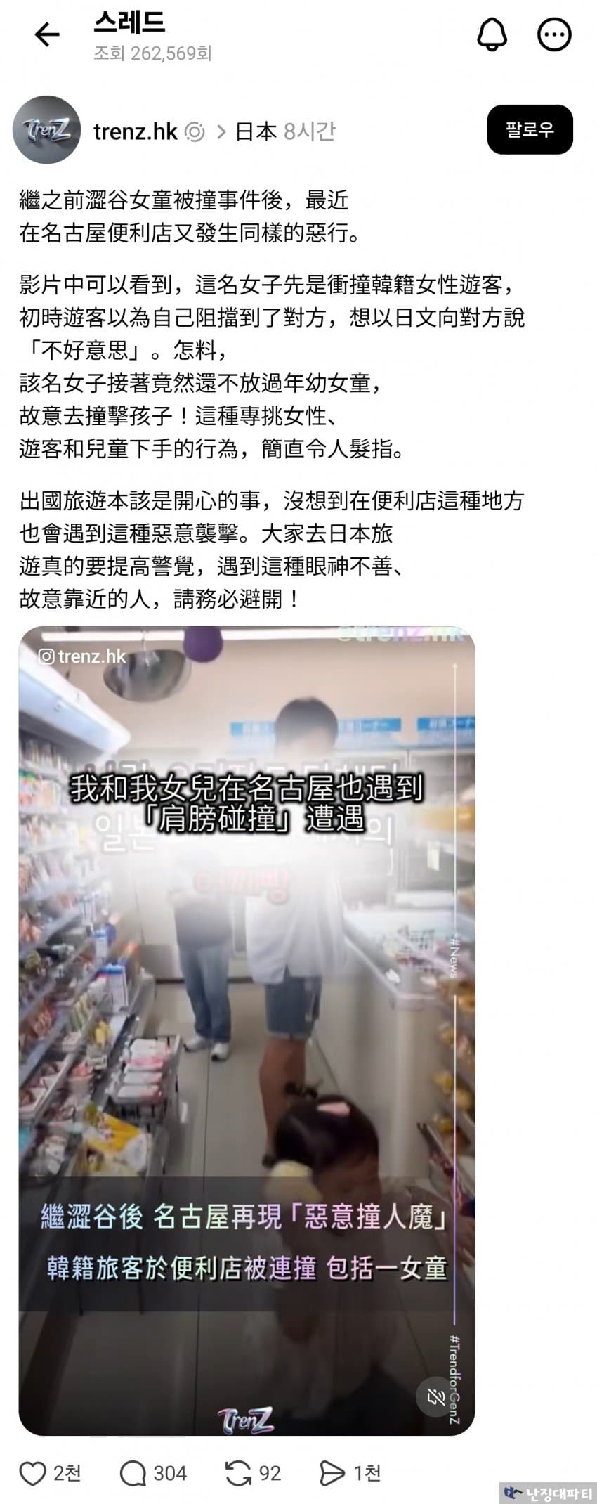 이전에 시부야에서 여아가 부딪힘을 당한 사건에 이어, 최근 나고야의 한 편의점에서도 같은 악행이 발생했습니다.