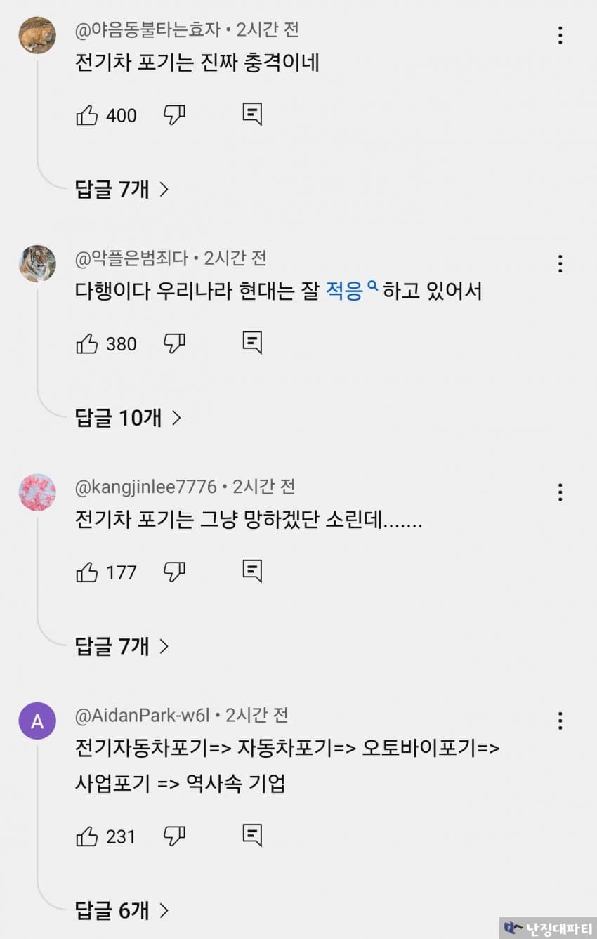 유럽과 한국은 정책적으로 강제 전기차 할당을 늘려 나가고 있는데, 저렇게 전기차 생산을 포기하는 기업이 늘어나면은 결국은 자동차 후발 주자인 중국이 개이득이겠네