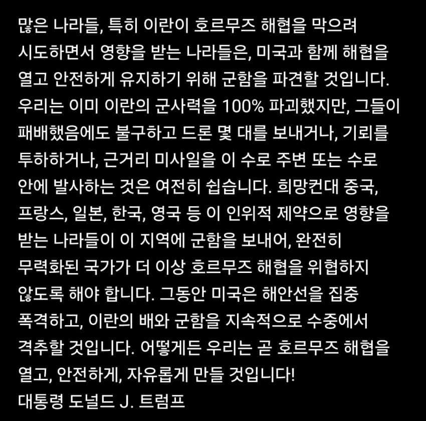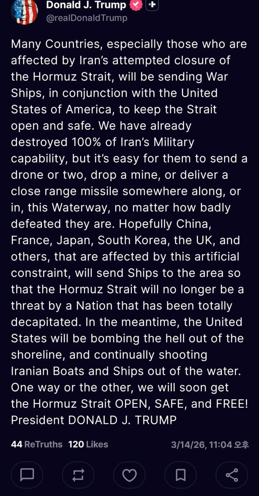 트럼프 한국 언급... 호르무즈 해협에 함정파견 요구