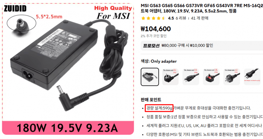 (MSI 노트북이 같은 충전기로 여러 노트북이 충전 가능하기도 한데, 모델마다 어뎁터 모양이 조금씩 다르기도함)