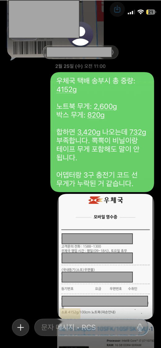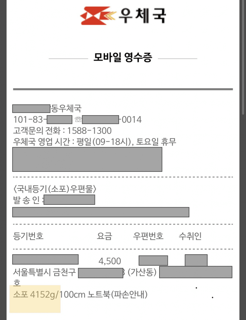 지인이 알려줘서, 우체국 택배 보낼 때 영수증에 중량 확인해 봄.. (혹시나 하는 마음으로)