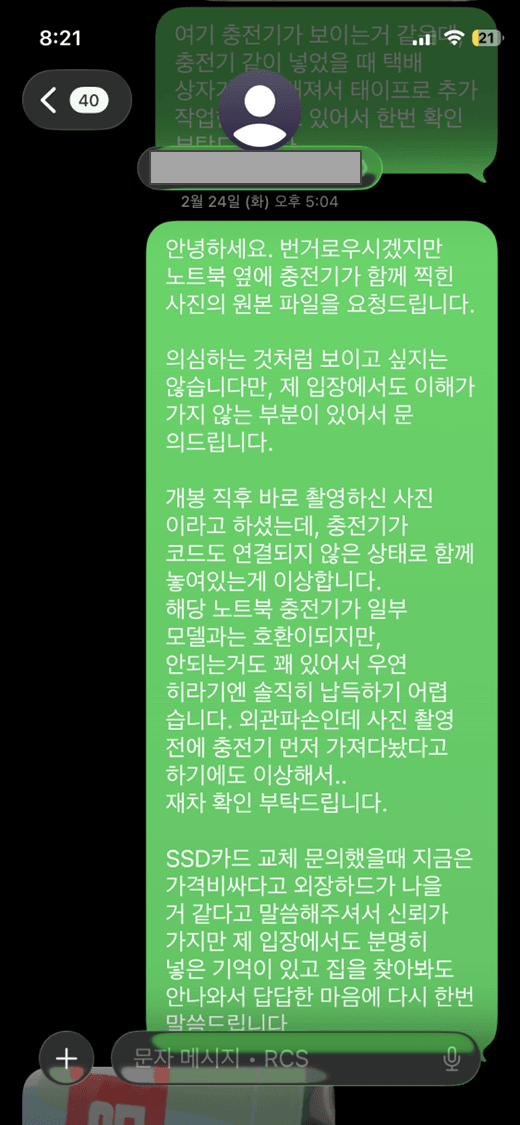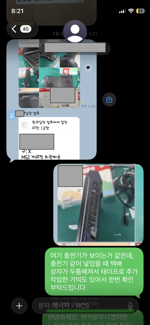 통화해서 나눈 내용은 충전기를 보내 줄 테니 노트북 충전 단자 부분 사진 찍어서 보내 달라고 함.
