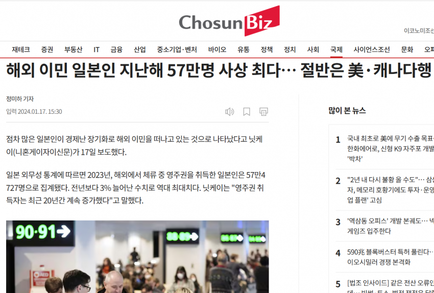 조선일보: 해외 이민 일본인 지난해 57만명 사상 최다… 절반은 美·캐나다행점차 많은 일본인이 경제난 장기화로 해외 이민을 떠나고 있는 것으로 나타났다고 닛케이(니혼게이자이신문)가 17일 보도했다.일본 외무성 통계에 따르면 2023년, 해외에서 체류 중 영주권을 취득한 일본인은 57만4727명으로 집계됐다. 전년보다 3% 늘어난 수치로 역대 최대치다. 닛케이는 "영주권 취득자는 최근 20년간 계속 증가했다"고 말했다