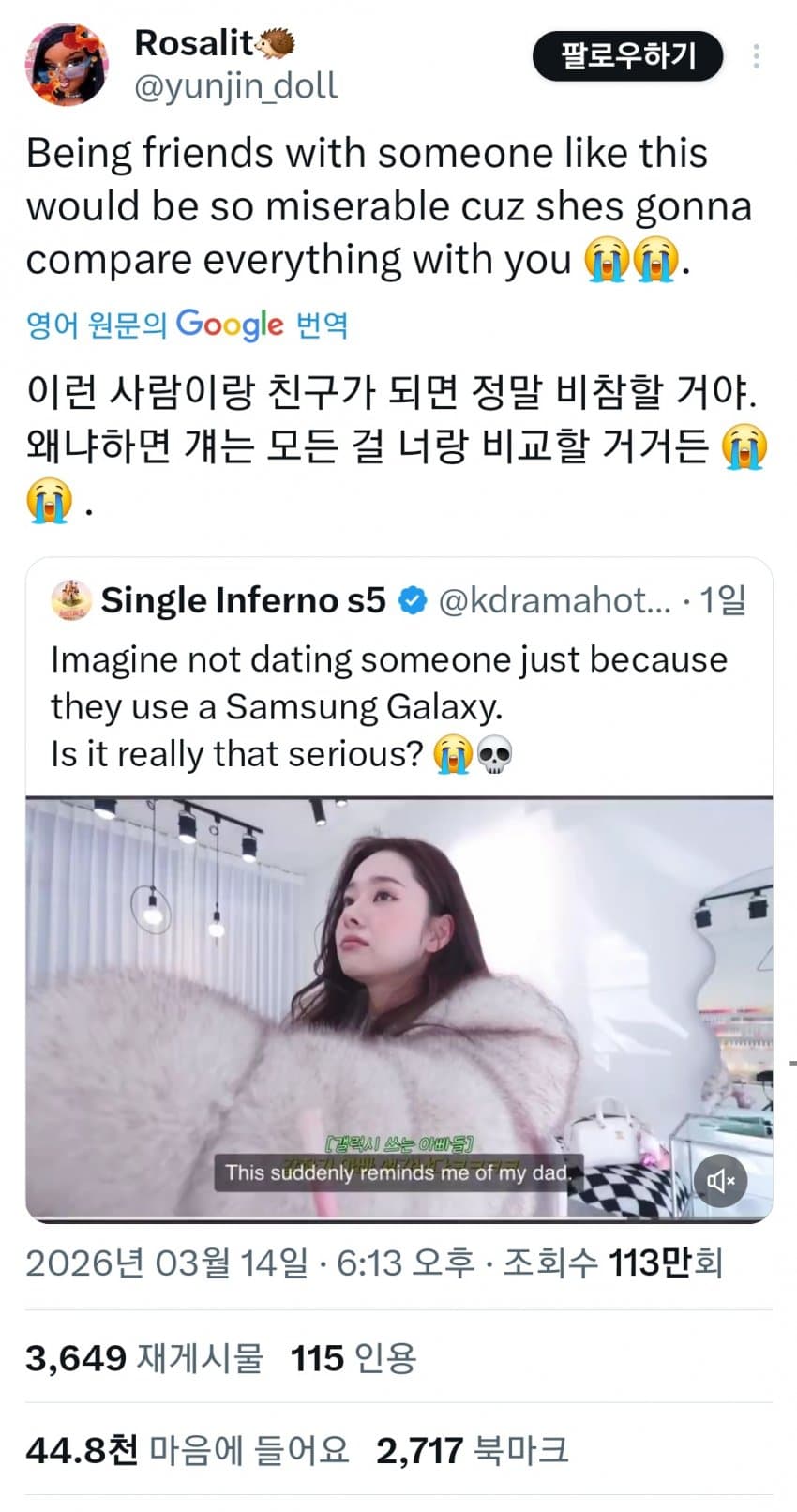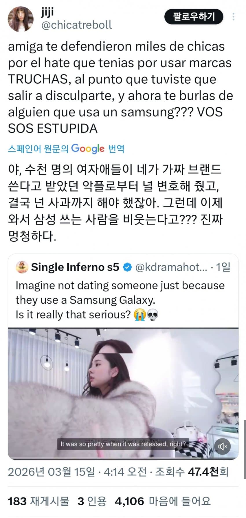 철 없는 10대~20대 초반 애가 저러면 이해하겠는데 30살 넘은 아줌마가 저 지랄 떨고 있으니 참....뭐라 표현을 해야될지 모르겠다