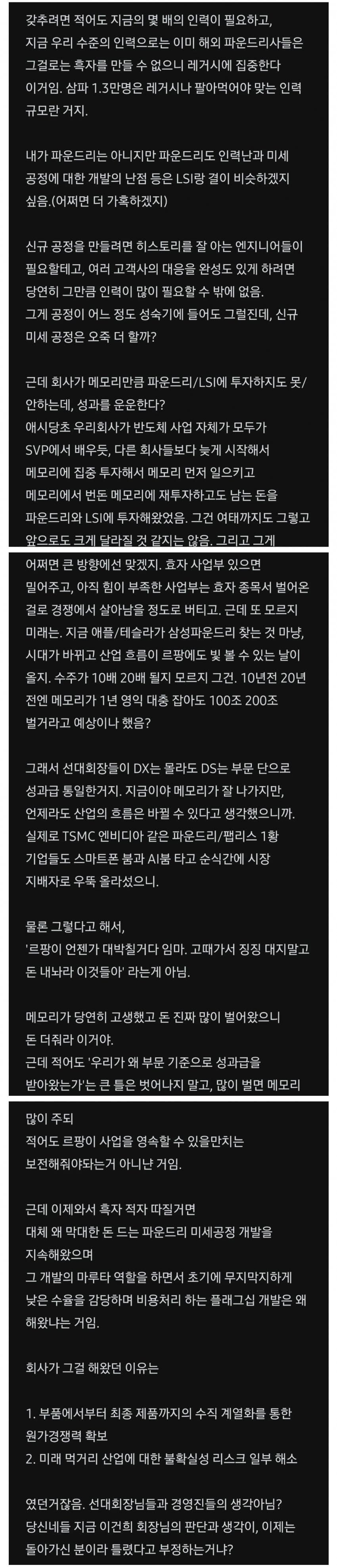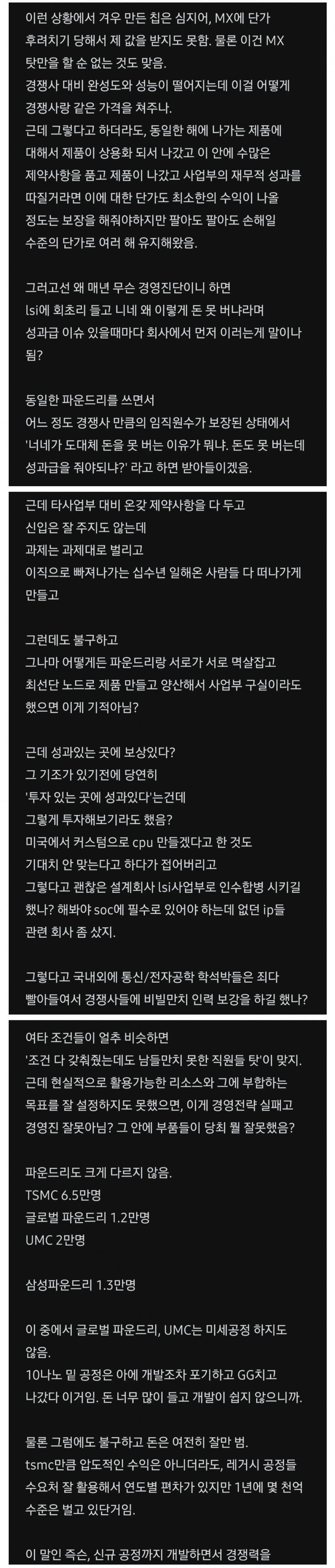 메사인데 팡르시 형님들 제일큰 문제는 MX에 후려치기 당한다는거임. MX가 항상 성과급 빠방하게 받는게 폰팔이놈들이 잘해서가 아님ㅋㅋ DS가 MX에 넘기는 물량들 전부 염가에 후려치면 MX놈들은 조립만하니까 IOS 비하면 개ㅂㅅ같이 폰만들어도 영익이 ㅈㄴ남음 사실 MX 영익 공로 80%가 DS인데 그걸 인정안하니까 메모리포함 전체 DS 인력이 다 탈출하는거