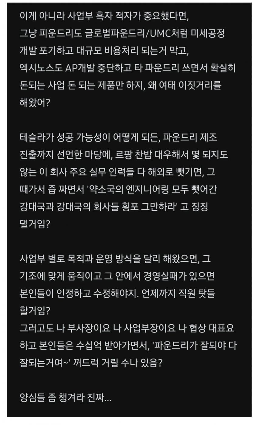 TSMC는 사실 대만 평균월급 150만원 수준이라 내부직원 갈아넣어서 만드는건 똑같음. 삼성만의 문제는 아니긴함
