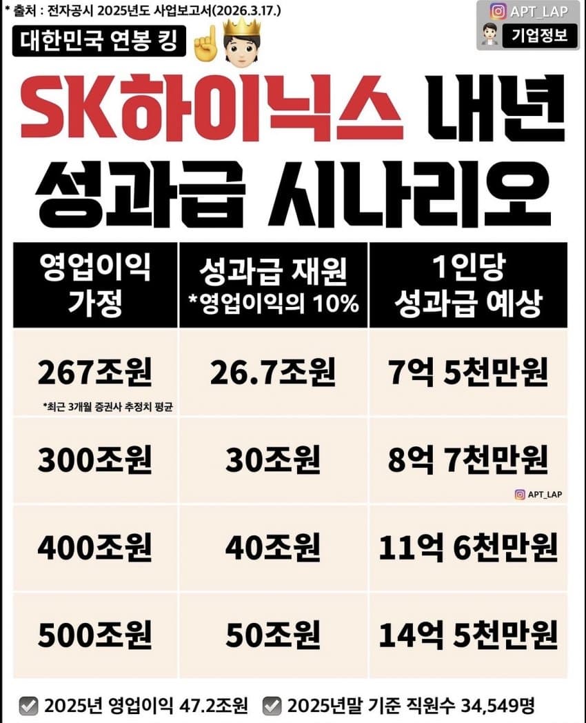 하이닉스 1분기 실적이 가시화되면서 올해 영익 250조 예상치의 가능성이 더욱 높아졌고 이정도만 실현돼도 하이닉스의 전 직원이 초봉5억, 평균7억을 가져간다