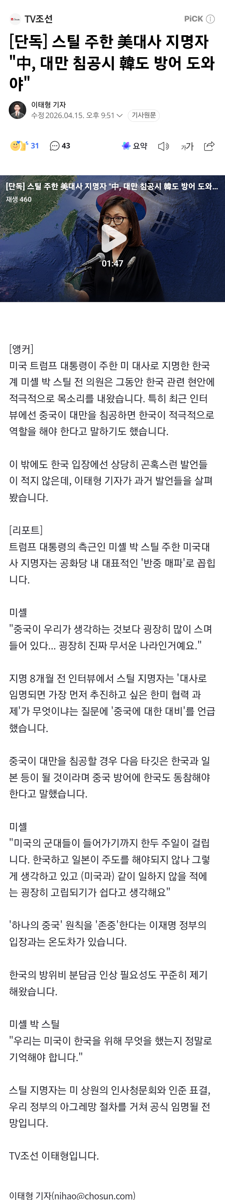 대만 도우라는 개소리는 검머외 저 사람의 사심이 들어간 소리고트럼프는 시진핑이랑 따뜻한 포옹하고 싶다고 하는데 뭘...차라리 검머외 정신 나간 여자를 대사로 오게 하느니 미국대사 공석인 상태가 훨씬 낫다