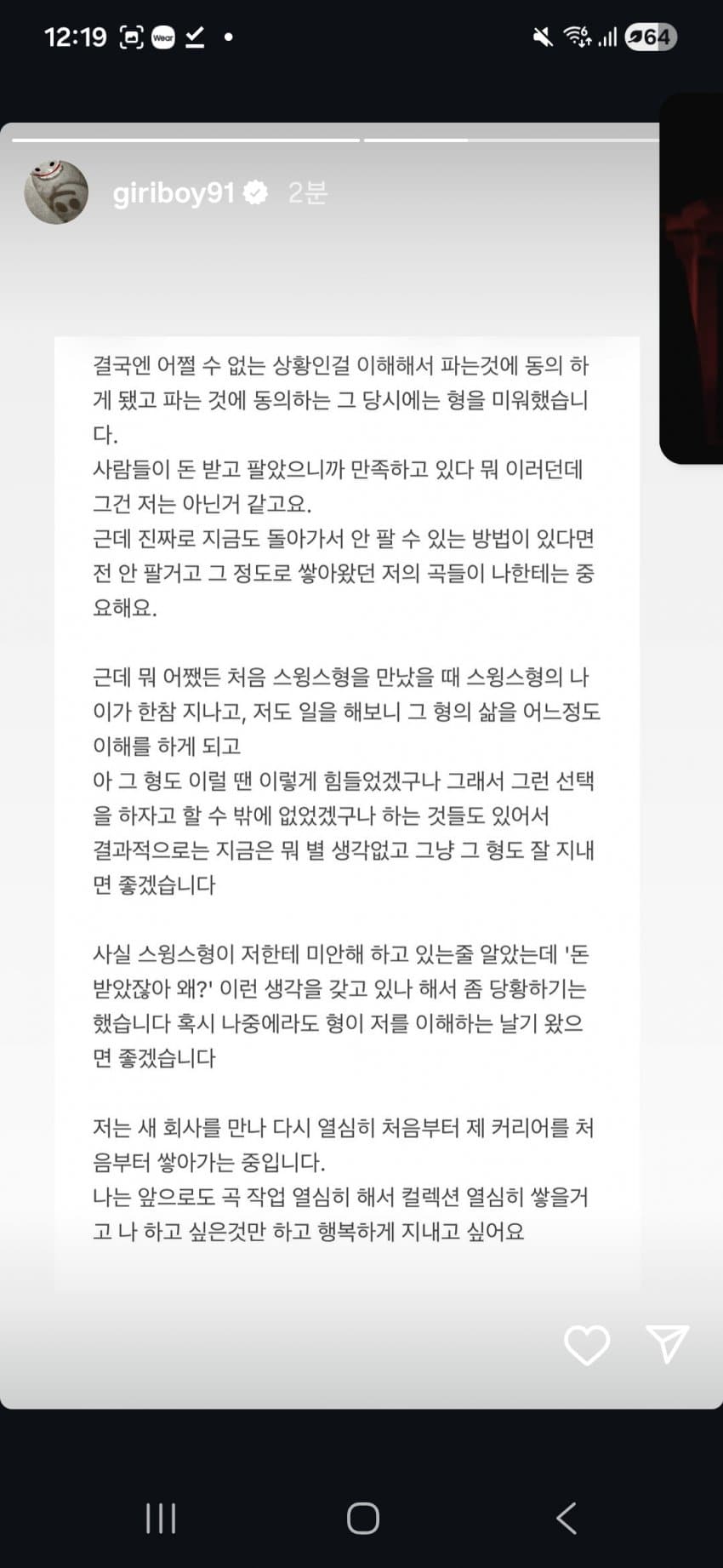 요약하면 곡은 어차피 회사꺼고 사정이 어려워서 어쩔수없이 인접권을 돈받고 넘기고 나머지 애들한테 돈 정산해줬는데 기리보이는 서운하다 이거임?