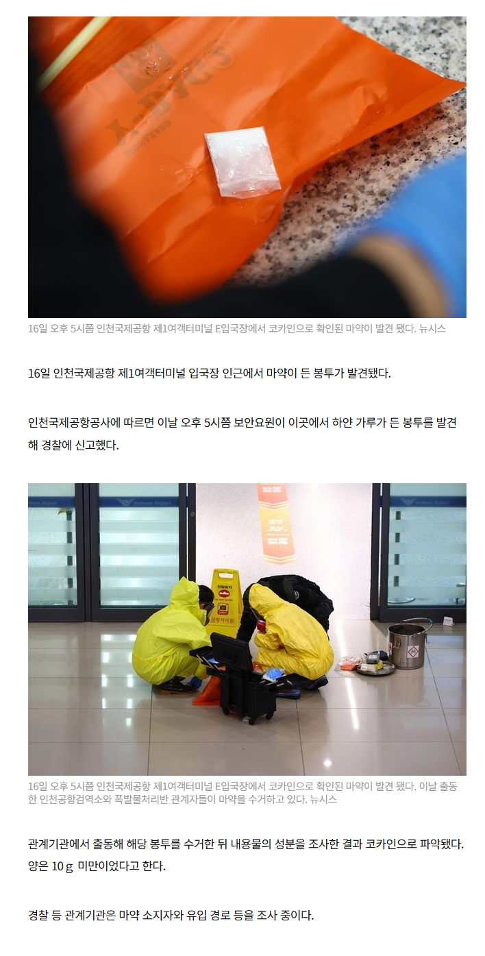 인천공항 입국장 앞 하얀가루…떨어진 마약 포착, 관계기관 수사