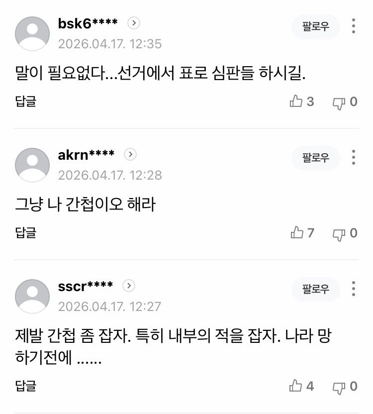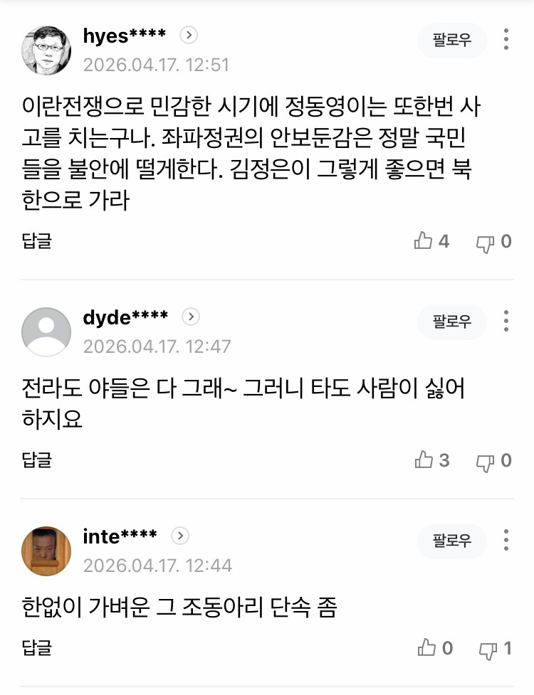 간첩이 뽑혔는데 부정선거도 없다는 소리는 국민들이 순수 빡대가리 노예들이라는 증명임...이런 썩은나라를 고쳐서 쓴다? 말도안되는 소리고 그냥 노예는 노예로 살도록 버려두고 정상인들이 탈출하는게 빠르다.정동영이 정보유출하고 다시 북한하고 교류하자고 헛소리할때 북한은 개성공단도 군사기지화해서 한명이라도 더 죽일생각중이다