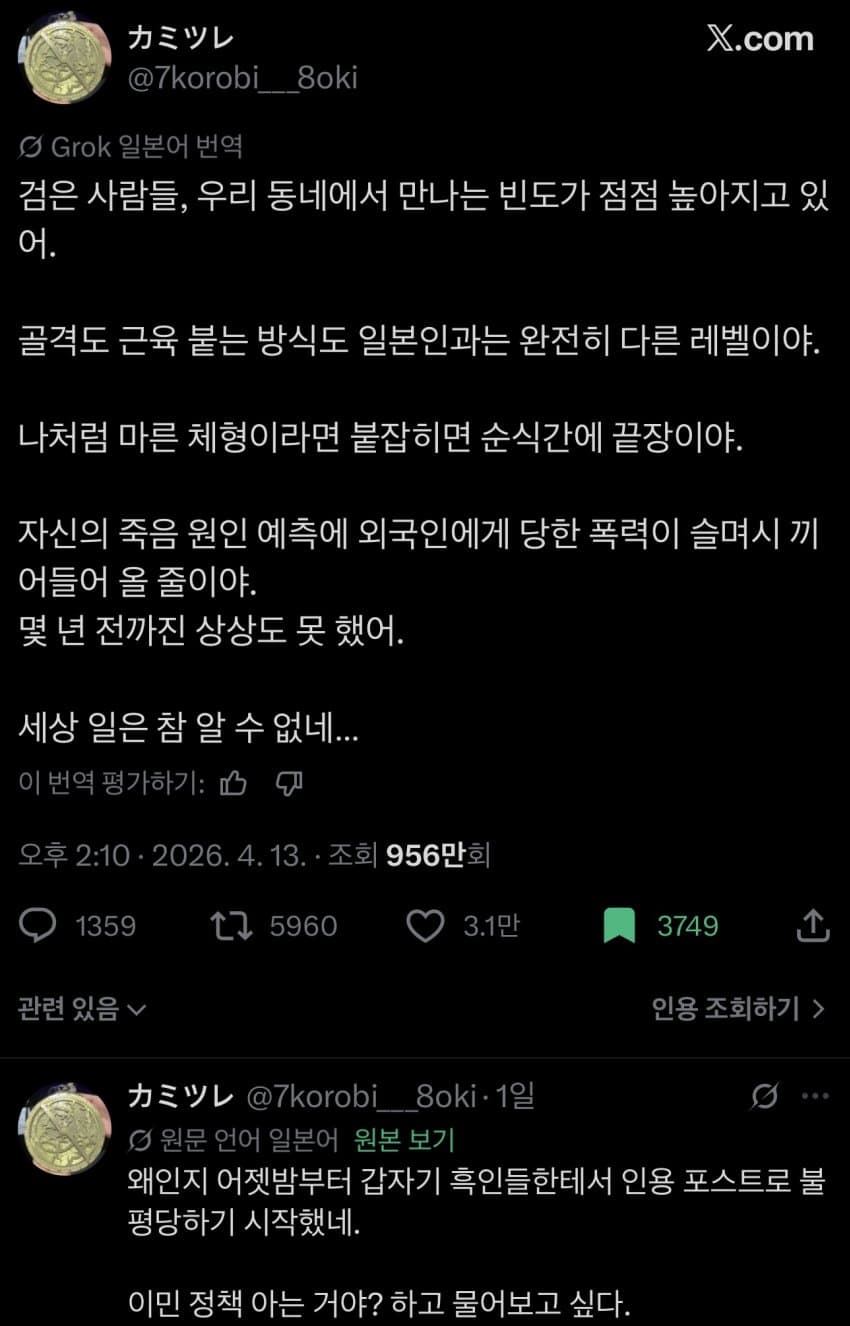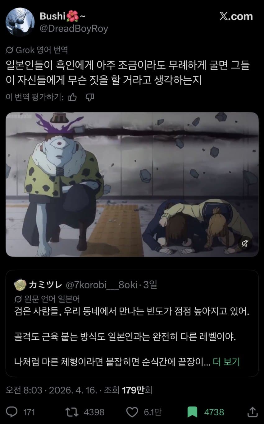 일본내 흑인이면 그냥 조센징보다 착하다고 보면됨 그런데도 일본흑인을 두려워 하는 수준이면 일본인은 과연 어느정도로 문명화된 민족인지 차마 감히 예측할수가 없다